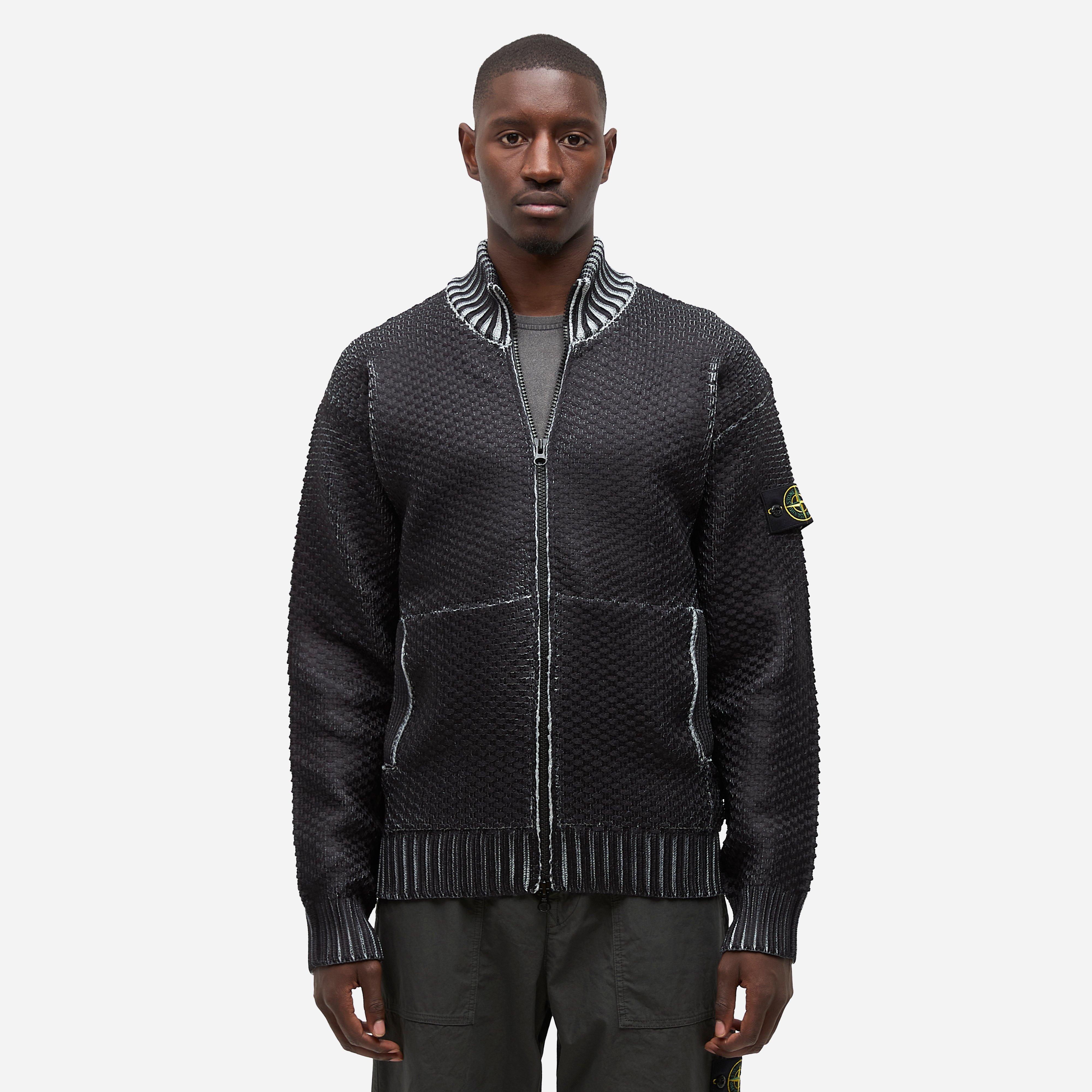 The Sublimatic Zip-Up Knit achieves a distressed guise through a unique printing process that uses heat and pressure to transfer dye over onto fabric. Grey – 75% polyester, 20% nylon, 5% elastane – Loose fit – Stand collar – Rib trims – Stand pockets – Compass badge – Model wears a size medium.