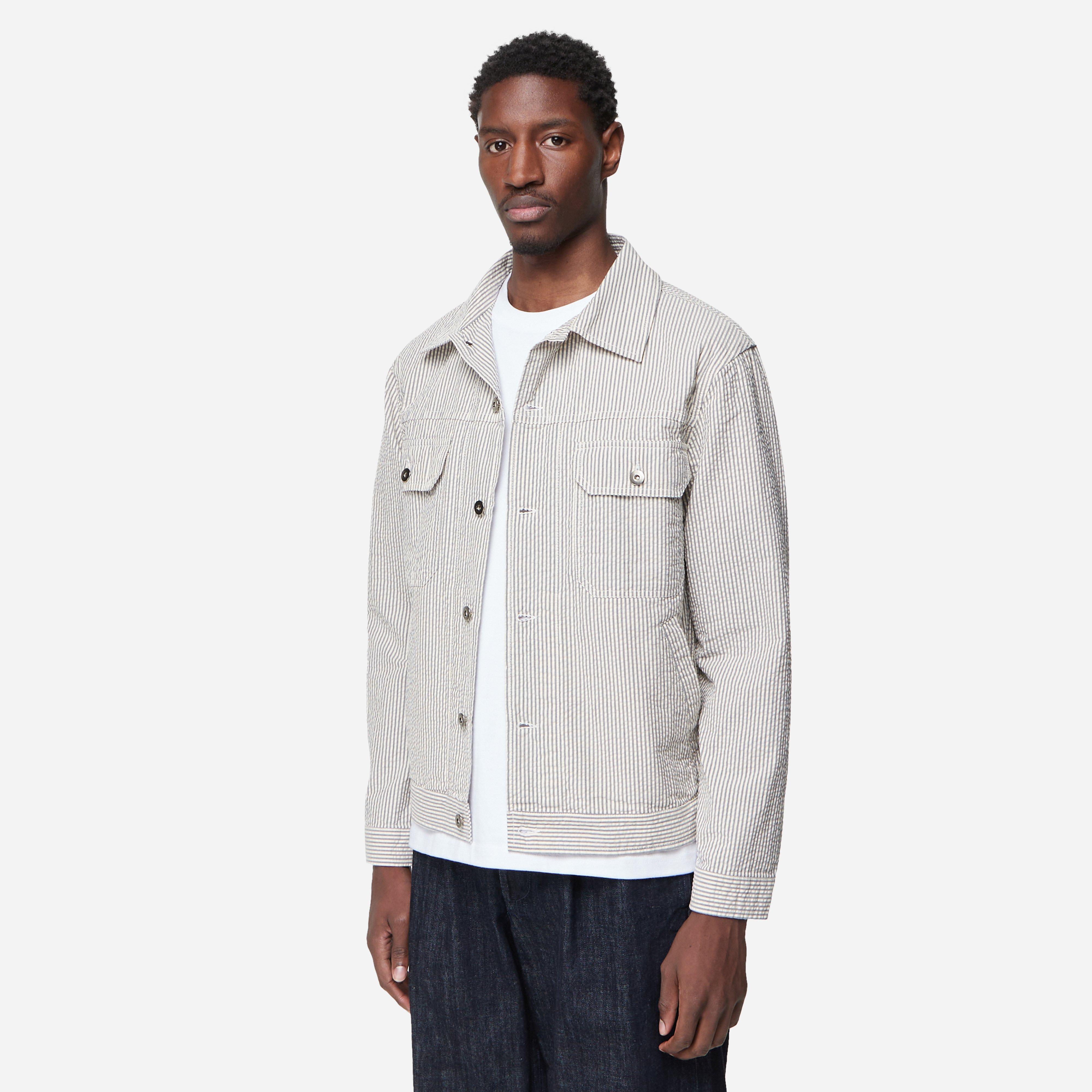 The Trucker Jacket is inspired by original denim workwear jackets finished in a grey pinstripe. Grey - 100% cotton - One piece collar - Chest pockets - Internal chest pocket - Button cuffs - Model is 6'1" and wears a size medium.