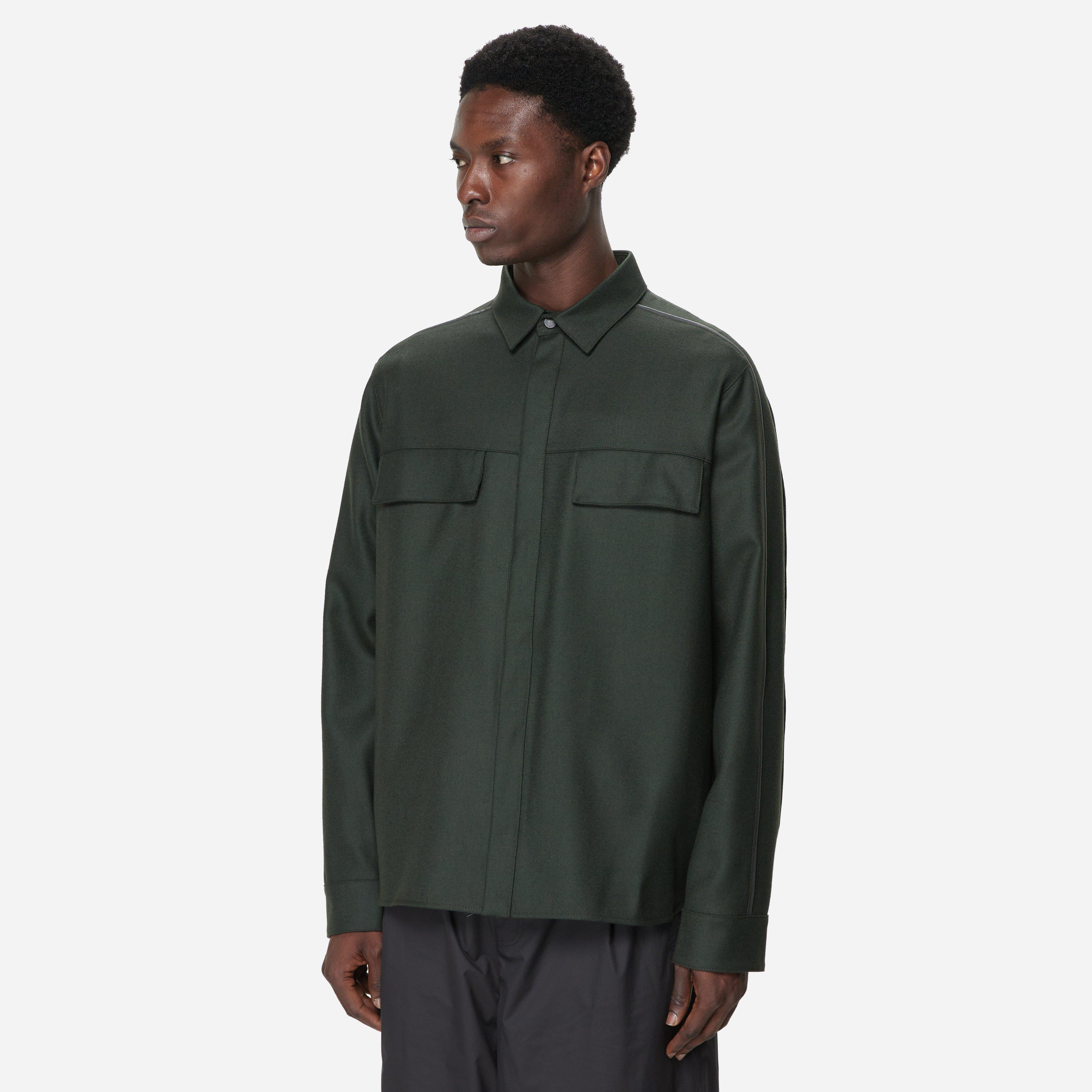 Green – 100% wool – Made in Italy – Relaxed fit – Spread collar – Two flap button pockets – Contrast piping – Buttoned cuffs – Model is 6’2’’ and wears a size medium.