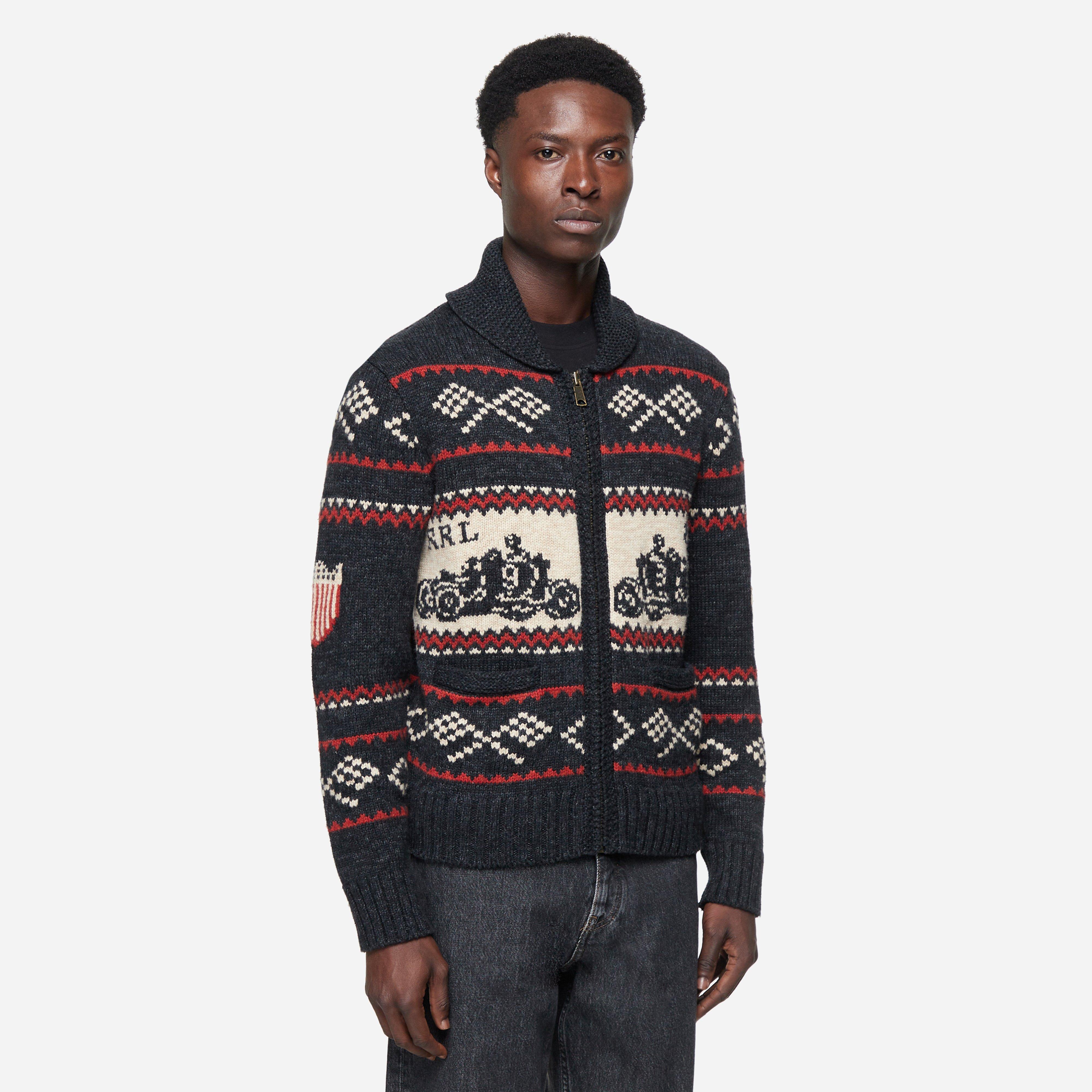The Shawl Cardigan derives design inspiration from racing with linen and wool yarns that are knitted using a float-jacquard technique in various patterns.