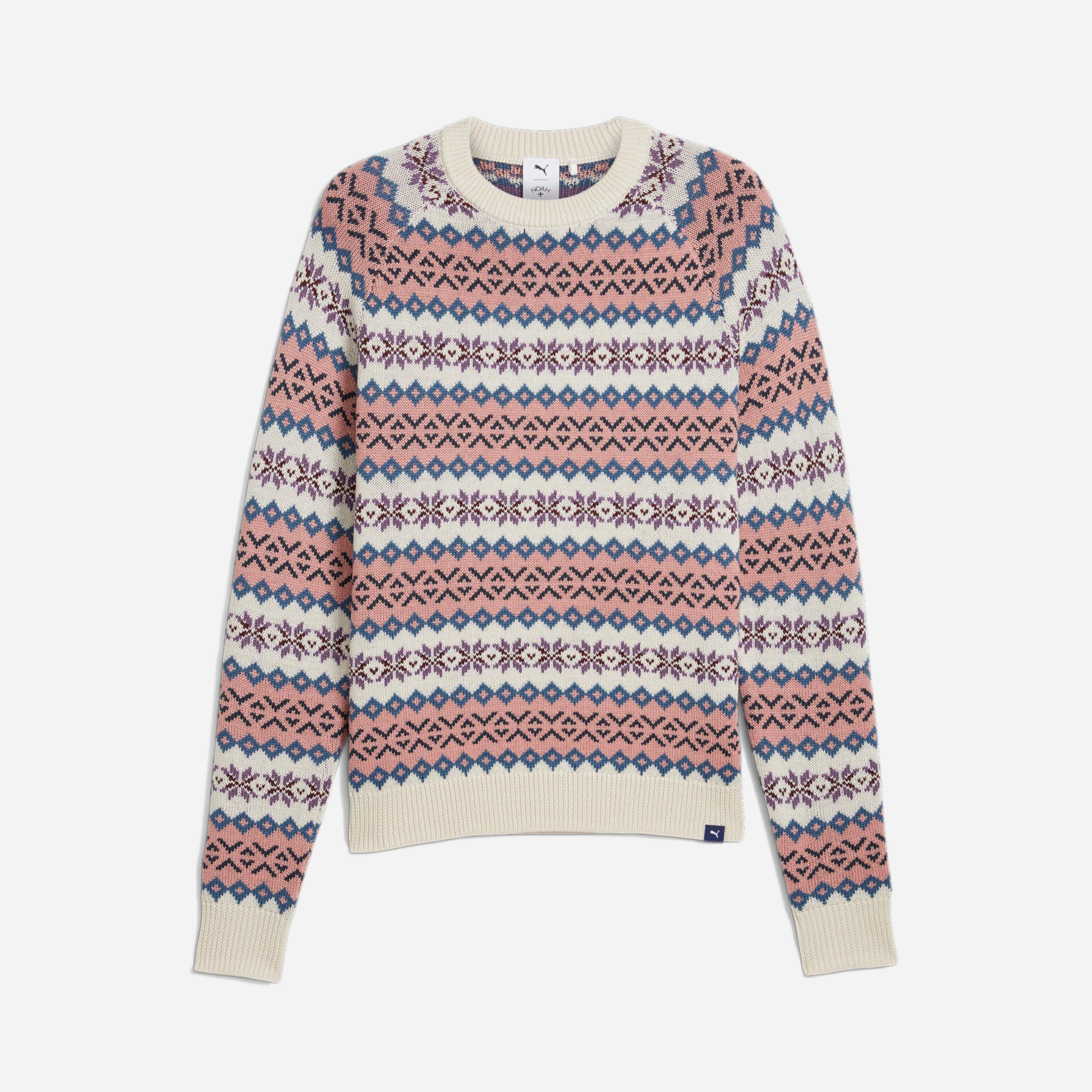 Pastel – 50% wool/50% acrylic – Raglan sleeves – Ribbed collar and cuffs – Jacquard print – Woven labelling – Model is 5’11’’ and wears a size medium.