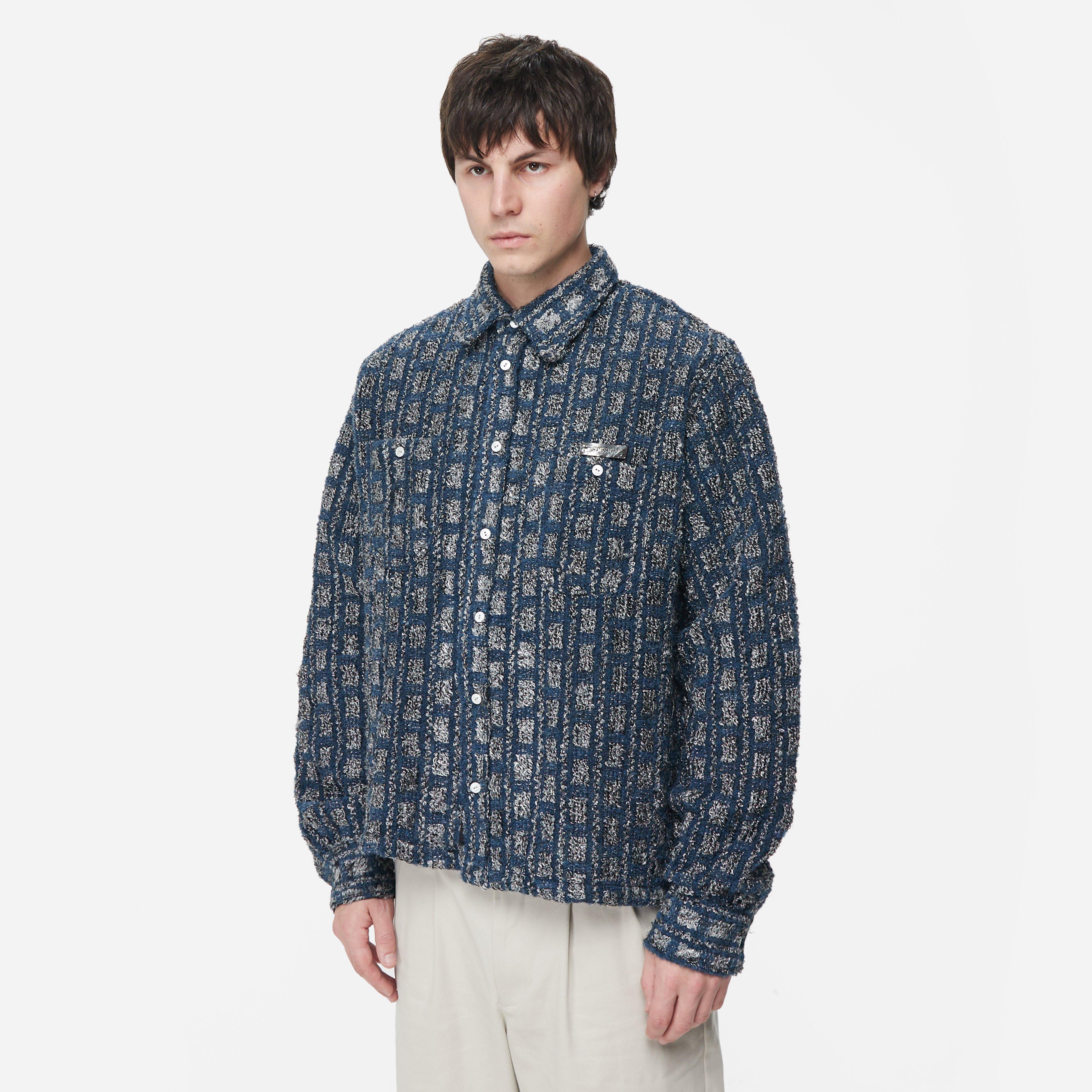 This piece is a boxy, American-style Work Shirt - an everyman staple elevated by a beautiful bespoke fabric. The material is from Bacus, a specialist mill that has produced a channel linked material - a navy/grey virgin wool base intricately braided with a curly black viscose yarn, creating the look of a special grid check plaid tweed. Navy - 41% viscose, 22% virgin wool, 13% alpaca, 22% polyester, 2% polyamide - 2 patch pockets - Mother of Pearl logo badge - Zinc enameled buttons - Made in Italy - Loose, slightly cropped fit, take your normal size - Model is 6'1" and wears a size medium.