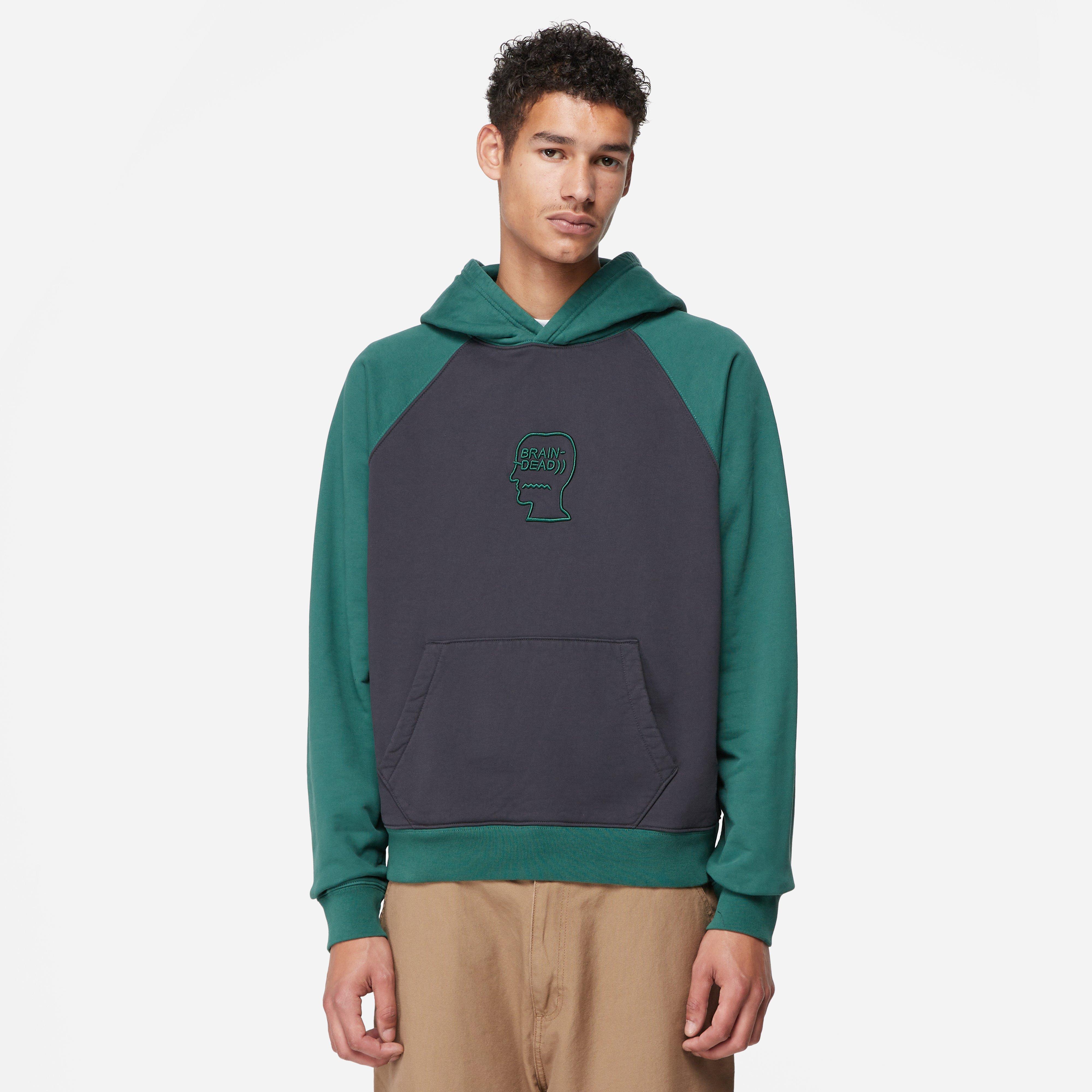 Brain Dead's pigment-washed Hoodie is made using heavyweight cotton fleece with contrast raglan sleeves and the label's disruptive logohead graphic.
