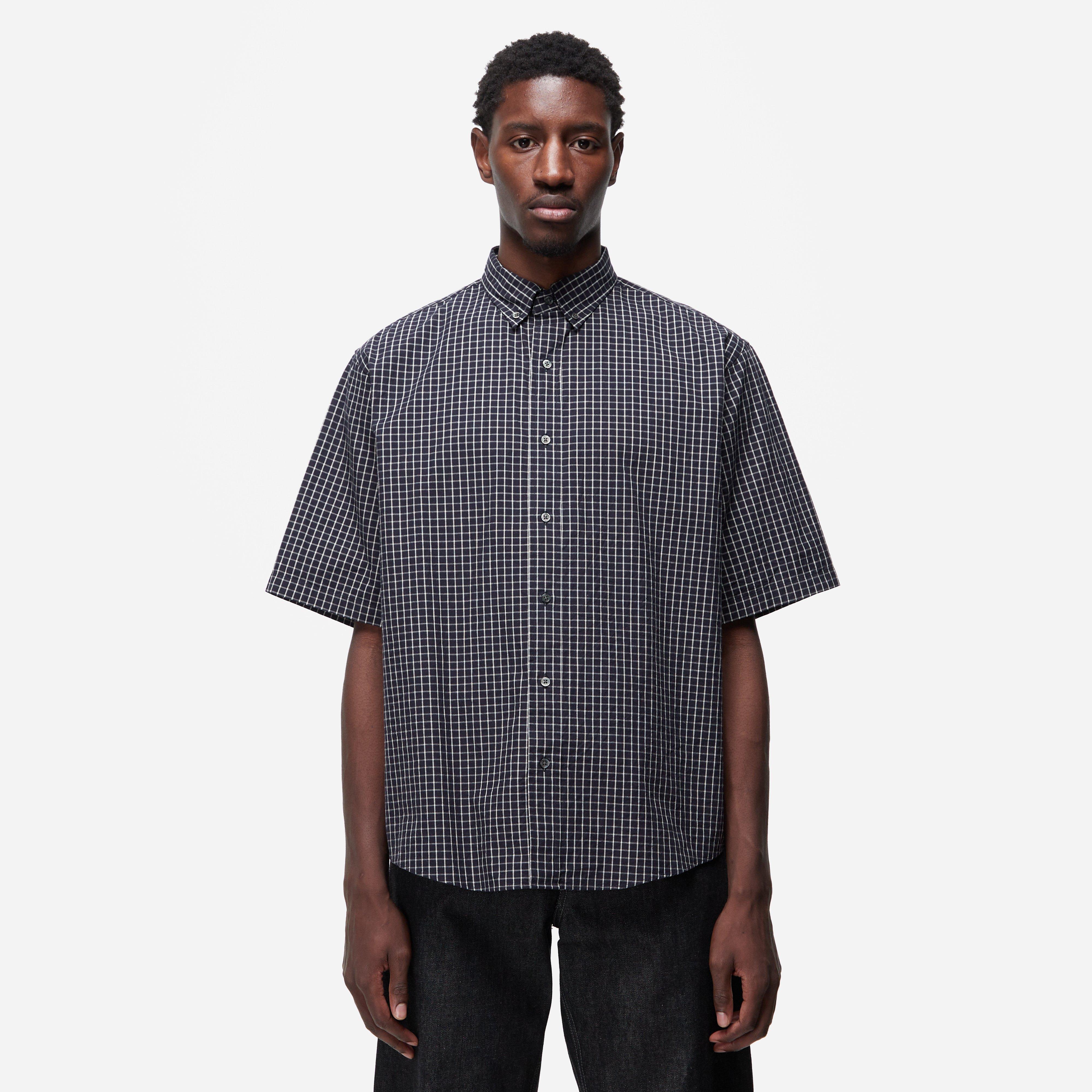 Black – 88% cotton, 6% linen, 6% rayon – Relaxed fit – Check pattern – Curved hem – Model is 6’1’’ and wears a size medium.