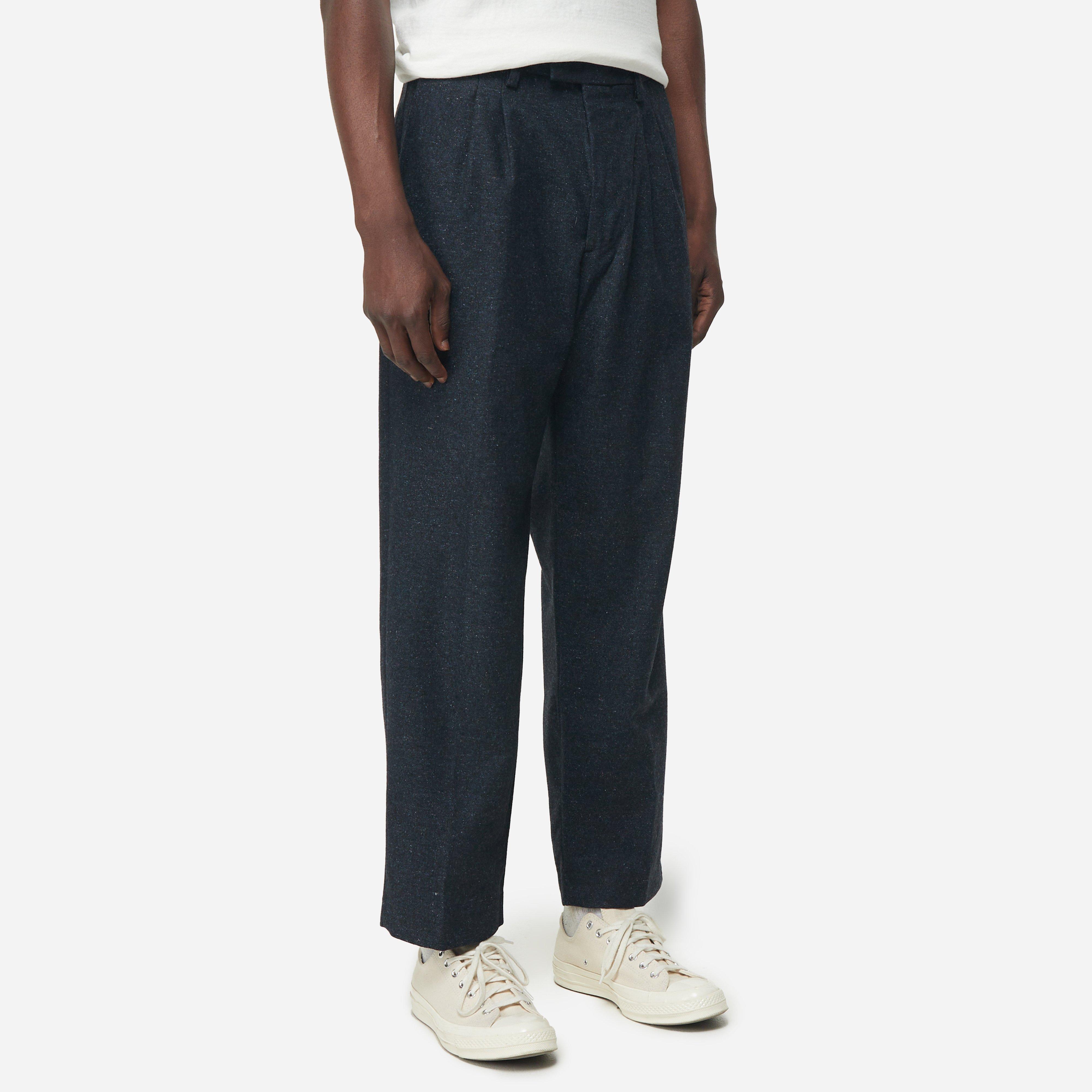 The Pant has pleats in the leg to create volume, tapering towards the ankle. Navy - 44% wool, 32% polyester, 15% acrylic, 5% silk, 3% polyamide, 1% elastane - Yarn-dyed - High-rise - Earhorn buttons - Woven in Italy - Loose, tapered fit, take your normal size - Model is 6'1" and wears a size 32 - Waist size guide (in.) - 30=32.6, 32=34.6, 36=38.6, 36=38.4