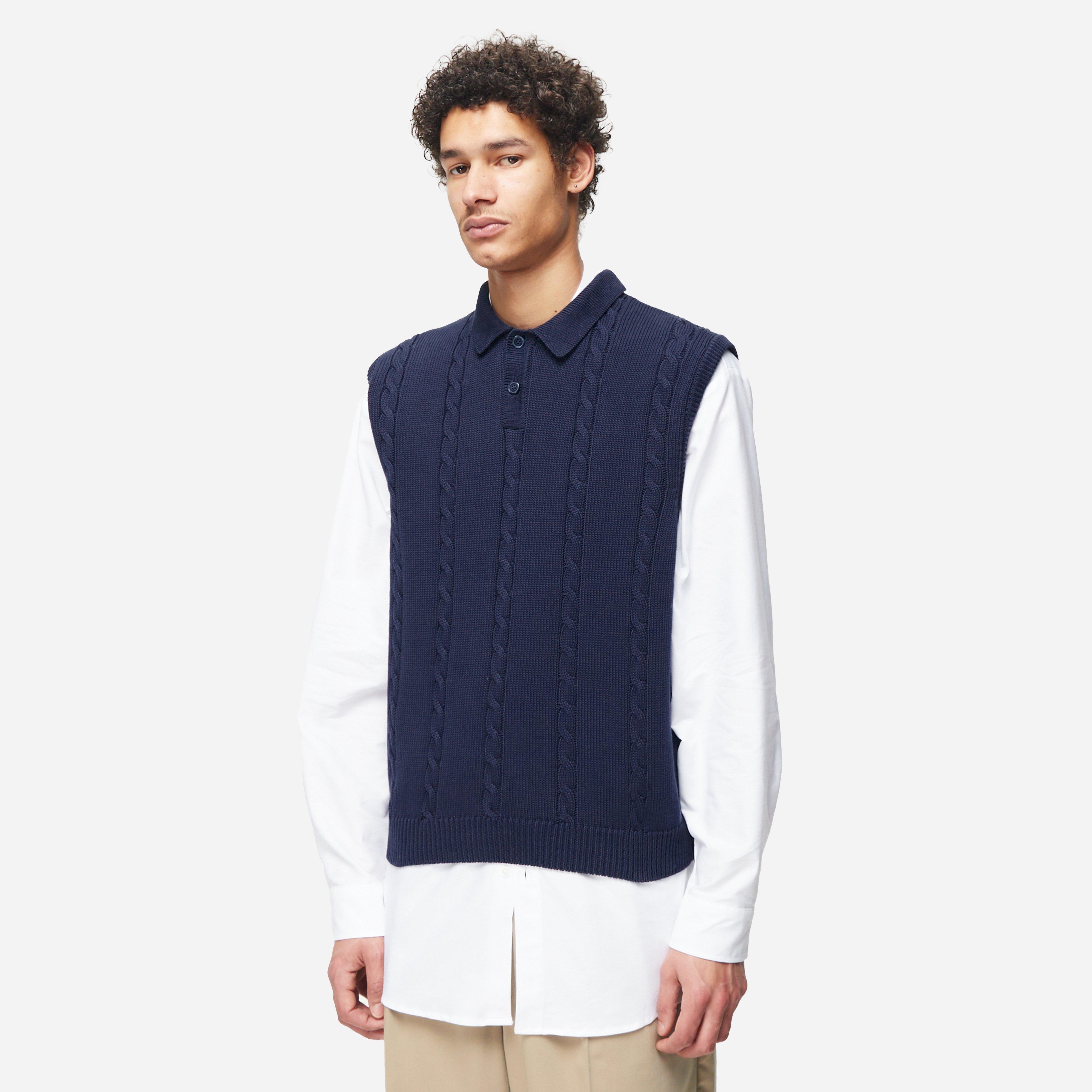 Noah's Vest is fully-fashioned, knitted from a wool-nylon blend in a staggered cable knit design touching on classic East Coast prep.