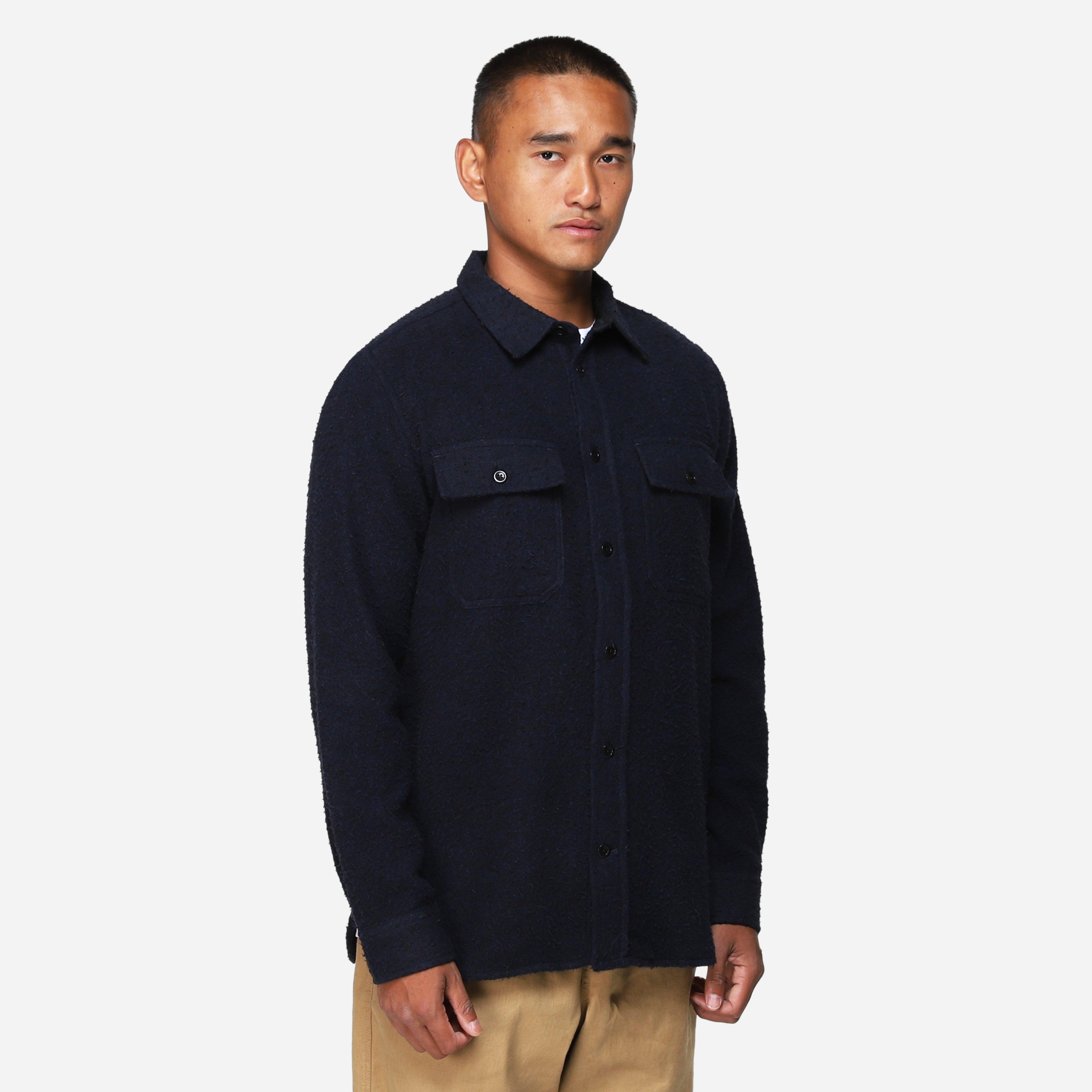 Navy - 50% cotton, 25% polyester, 20% wool, 5% other - 331gsm - Patch pockets - Twin-needle stitching - Corozo buttons - Button cuffs - Regular fit, take your normal size - Model is 6'0" and wears a size medium.