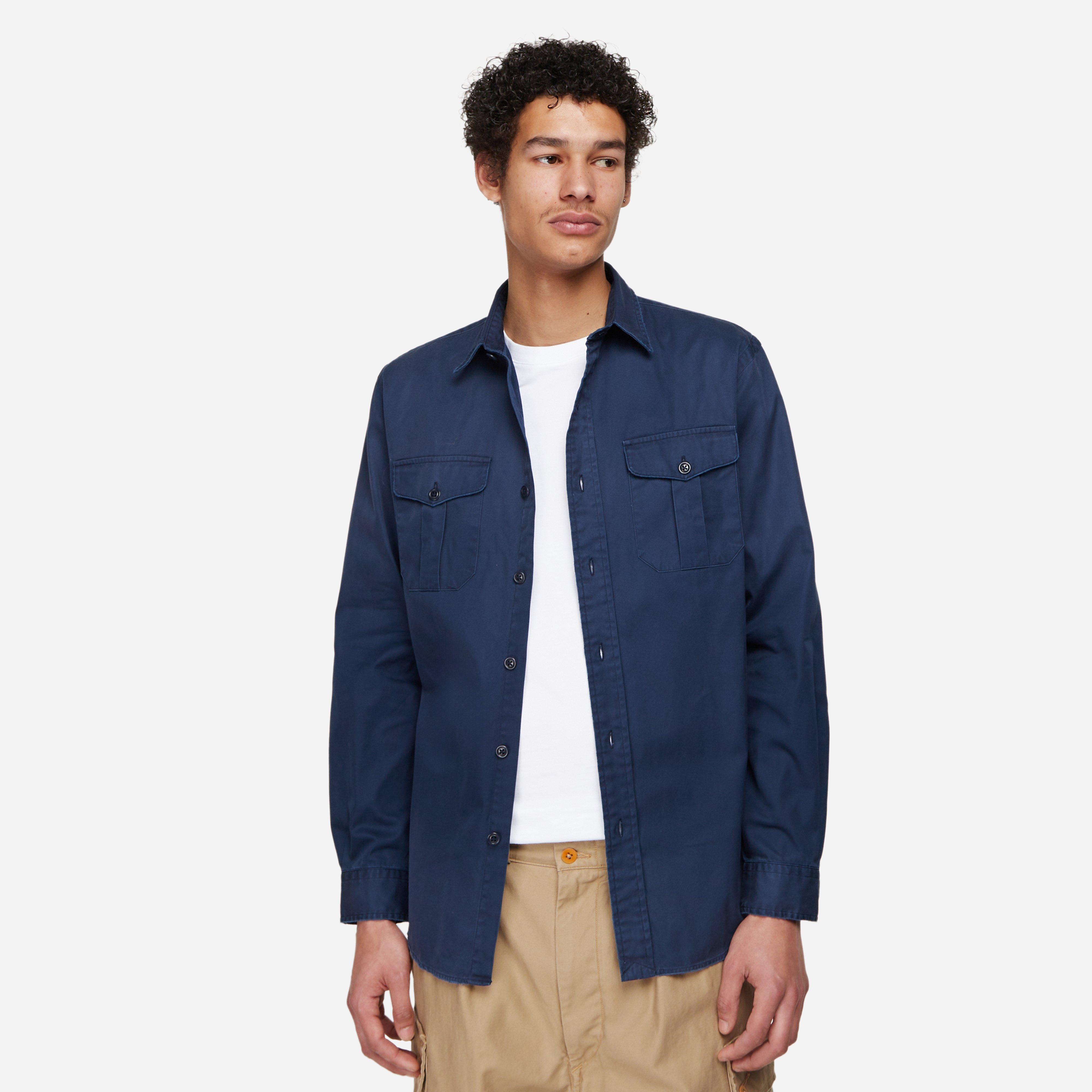Navy - 100% cotton - Split back yoke with box pleat - Corozo buttons - Flap pockets - Button cuffs - Point collar - Extended throat tab - Regular fit, take your normal size.