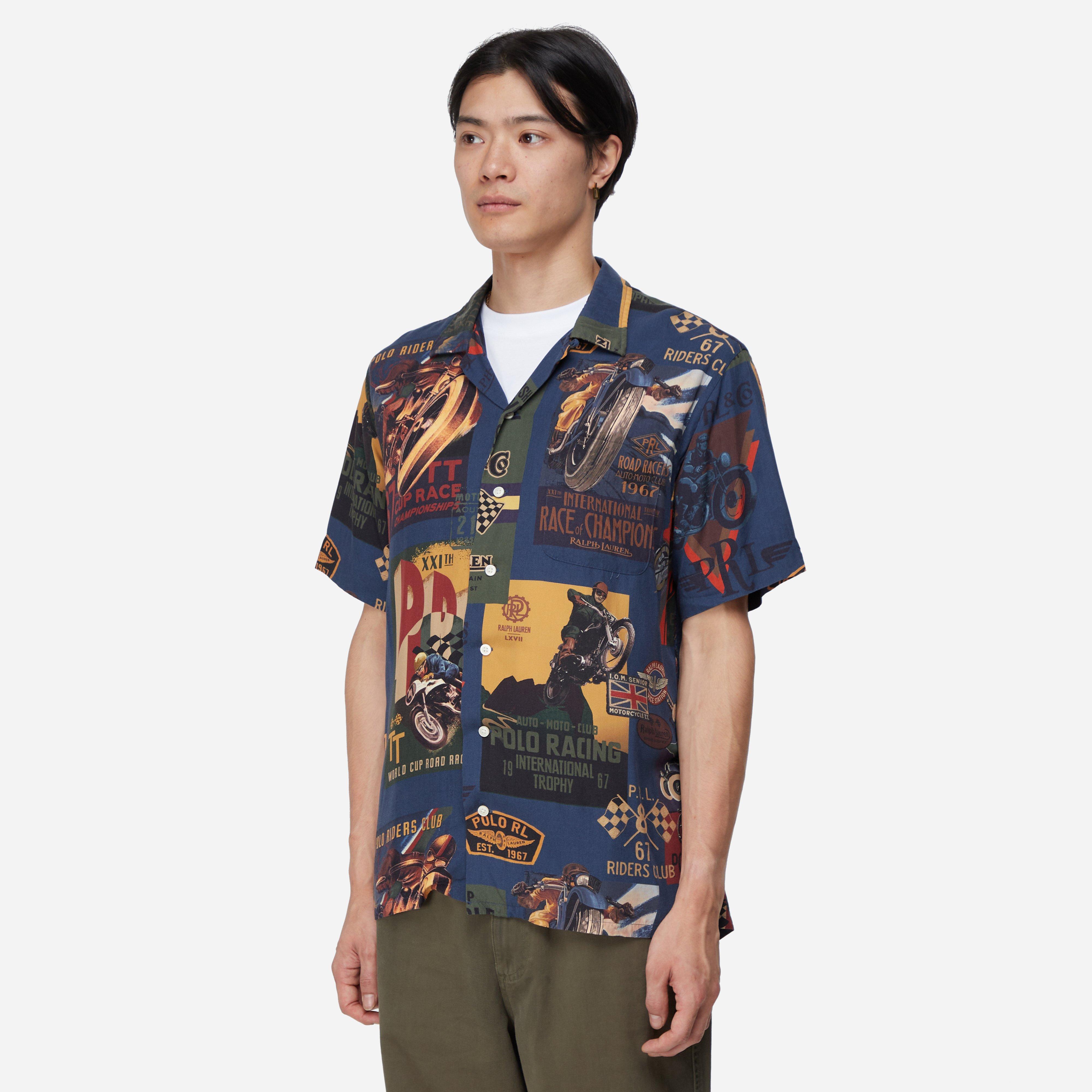 Navy - 100% cotton - Open collar - Graphic prints - Boxy fit, take your normal size - Model is 6'1" and wears a size medium.