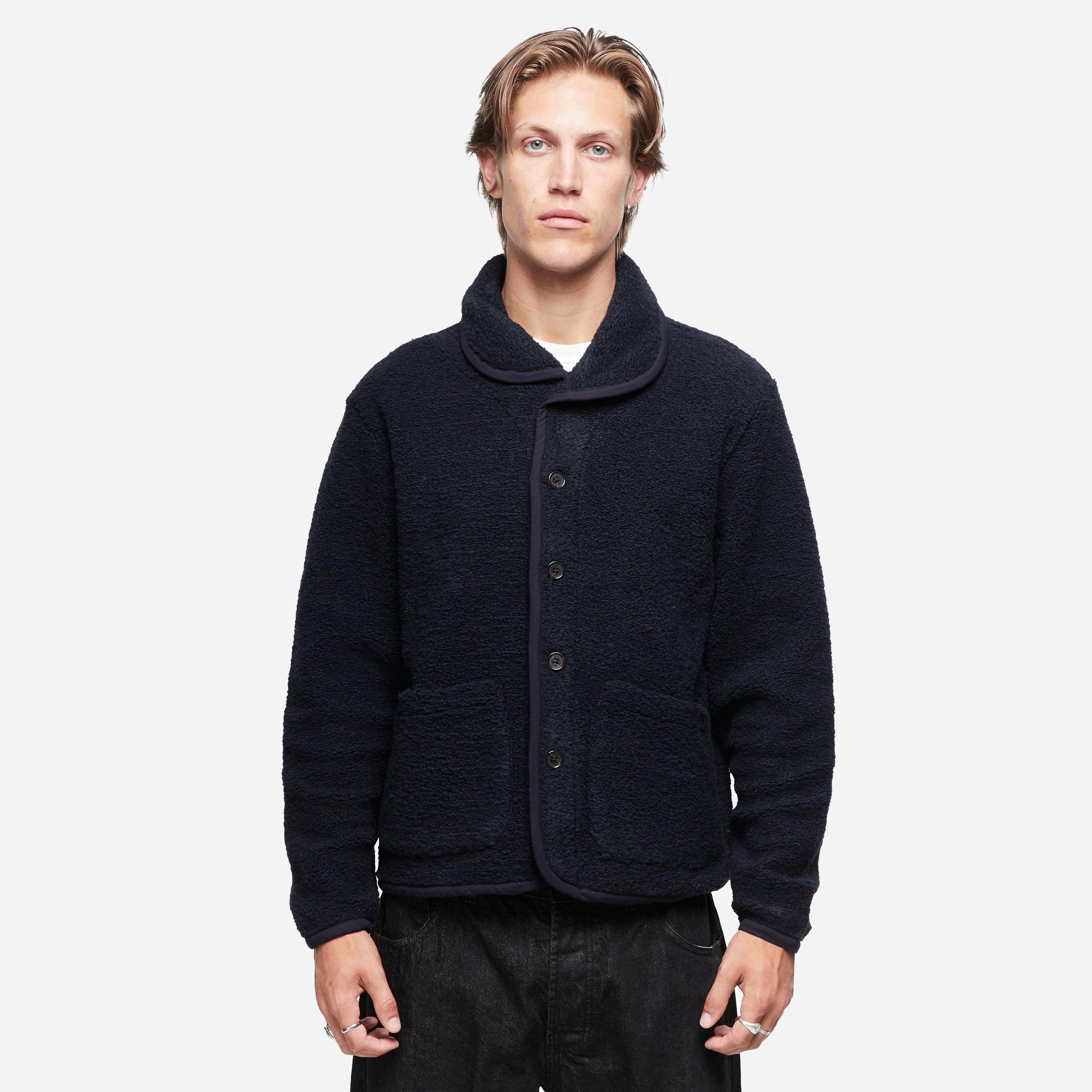 Navy - 70% recycled polyester, recycled wool - Regular fit - Shawl collar - Patch pockets - Model is 6'2.5" and wears a size medium.