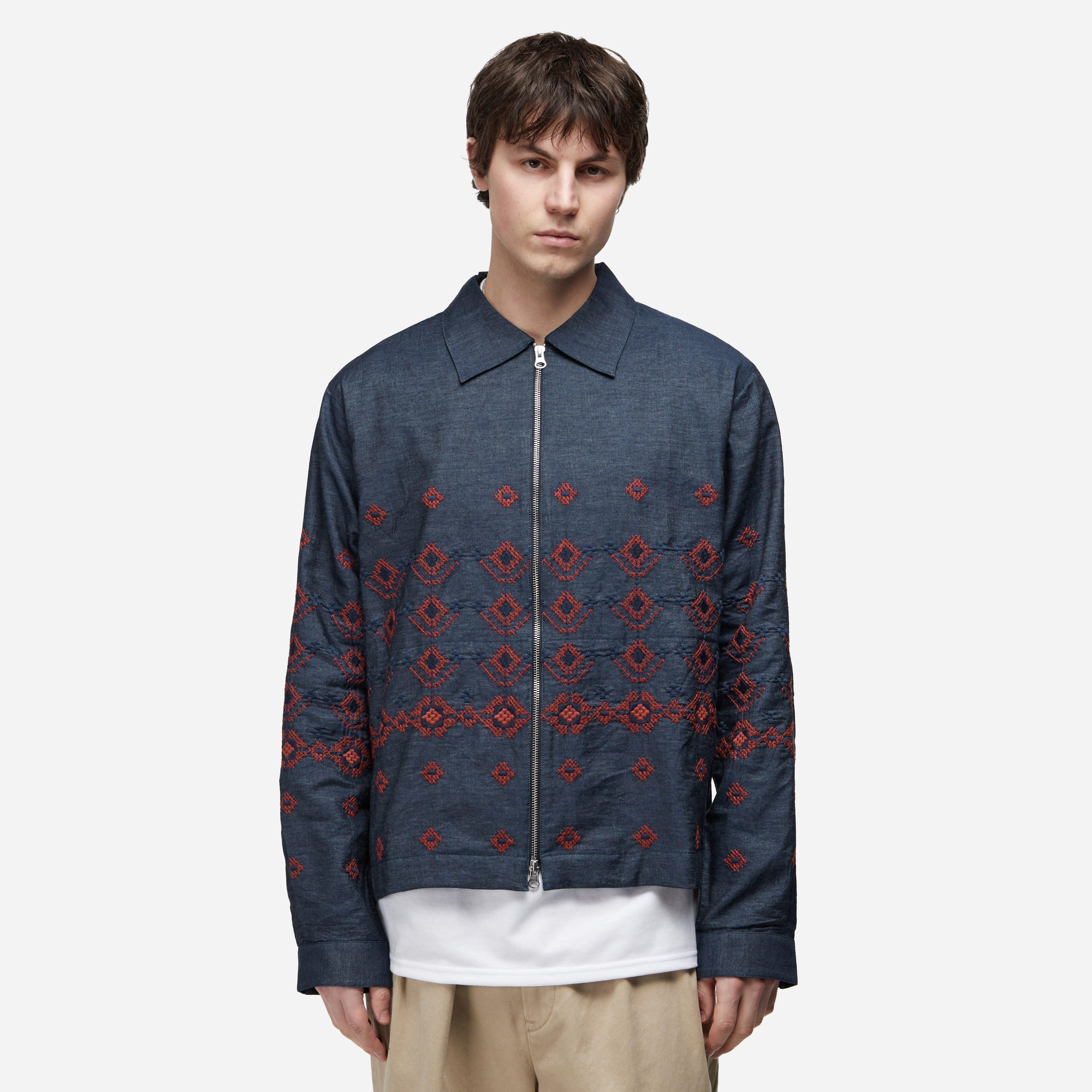 The Bowie Jacket by YMC is a midweight zipped denim jacket decorated with an intricate cross-stitch embroidery pattern inspired by vintage table cloths.