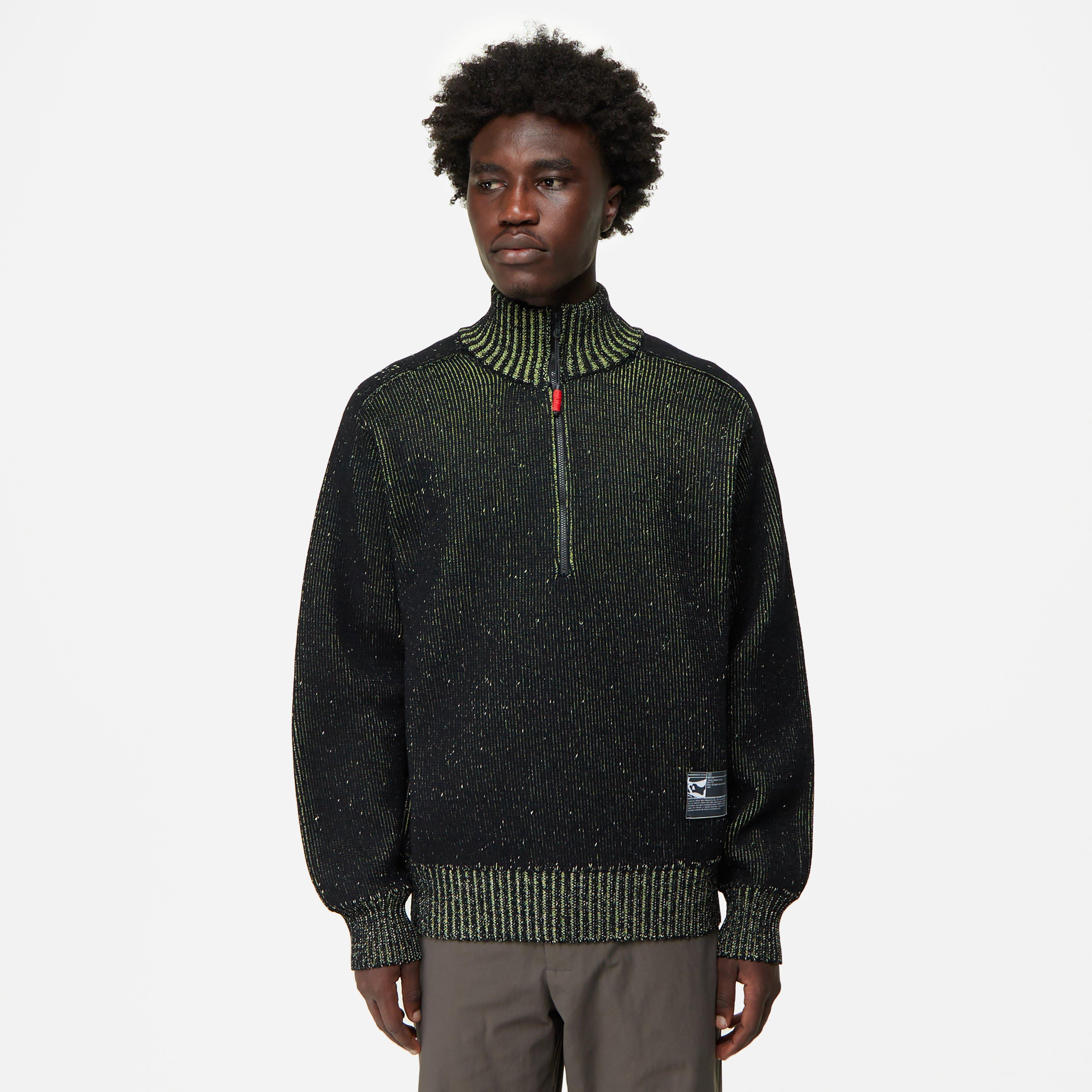 The Aimless Aramid High Neck utilises recycled fibres that have been repurposed from bulletproof vests. Black – 70% wool/30% Aramid – Quarter zip – Ribbed trims – Model is 6’2’’ and wears a size medium.
