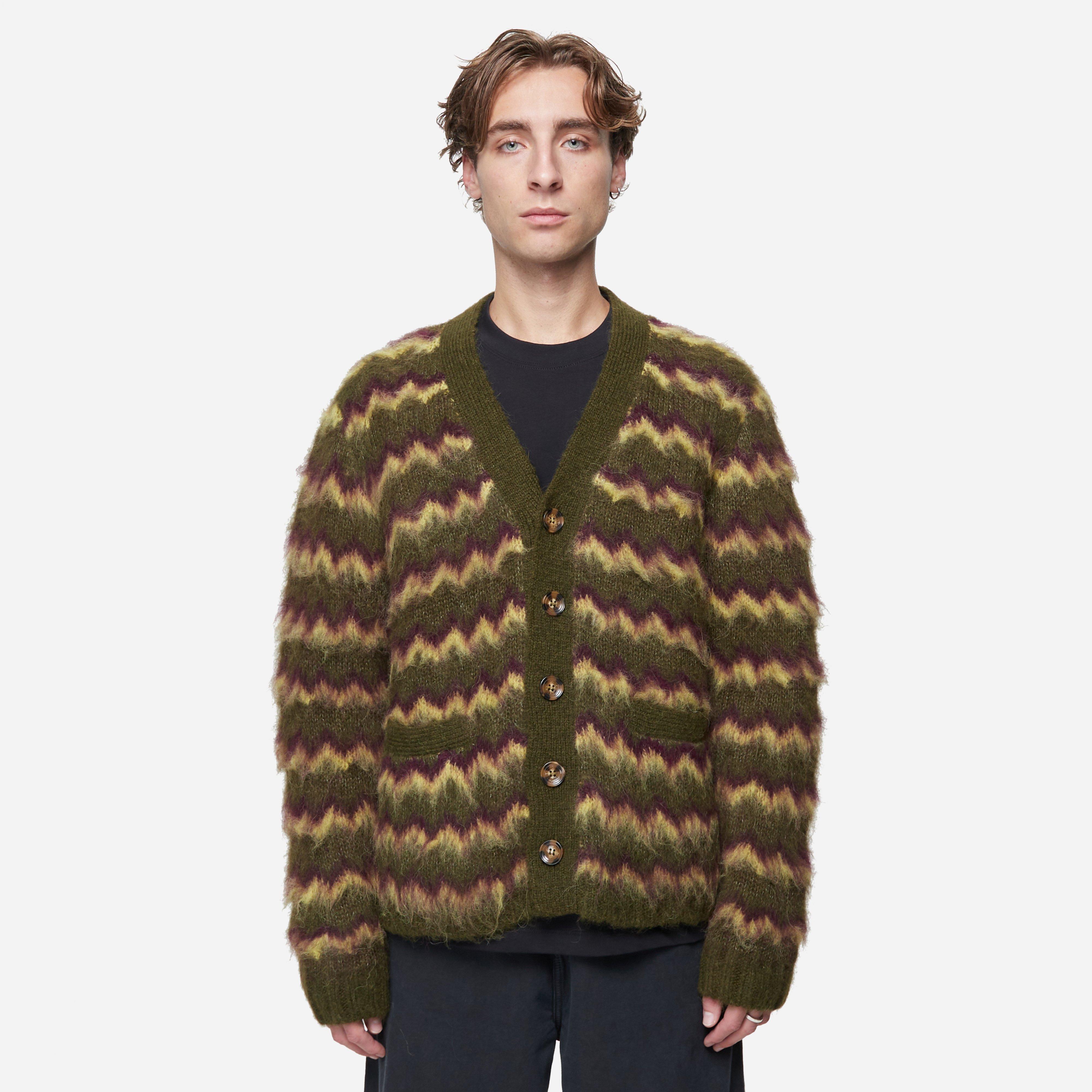 Olive – 89% alpaca wool/11% polyamide – Made in Peru – Tortoise shell buttons – Ribbed trims – Model is 5’11’’ and wears a size medium.