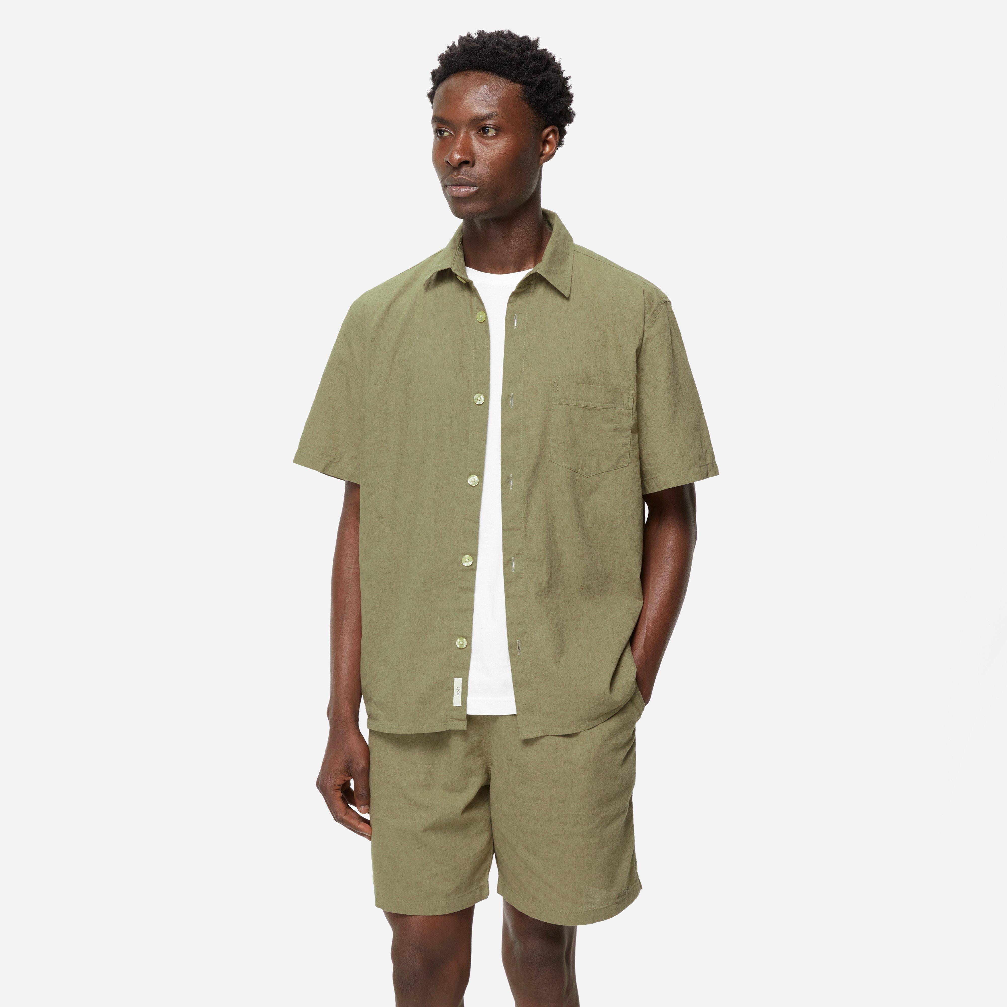 Olive – 70% cotton, 30% linen – Button down closure – Chest pocket – Made in Turkey - Model is 6'2" and wears a size medium.