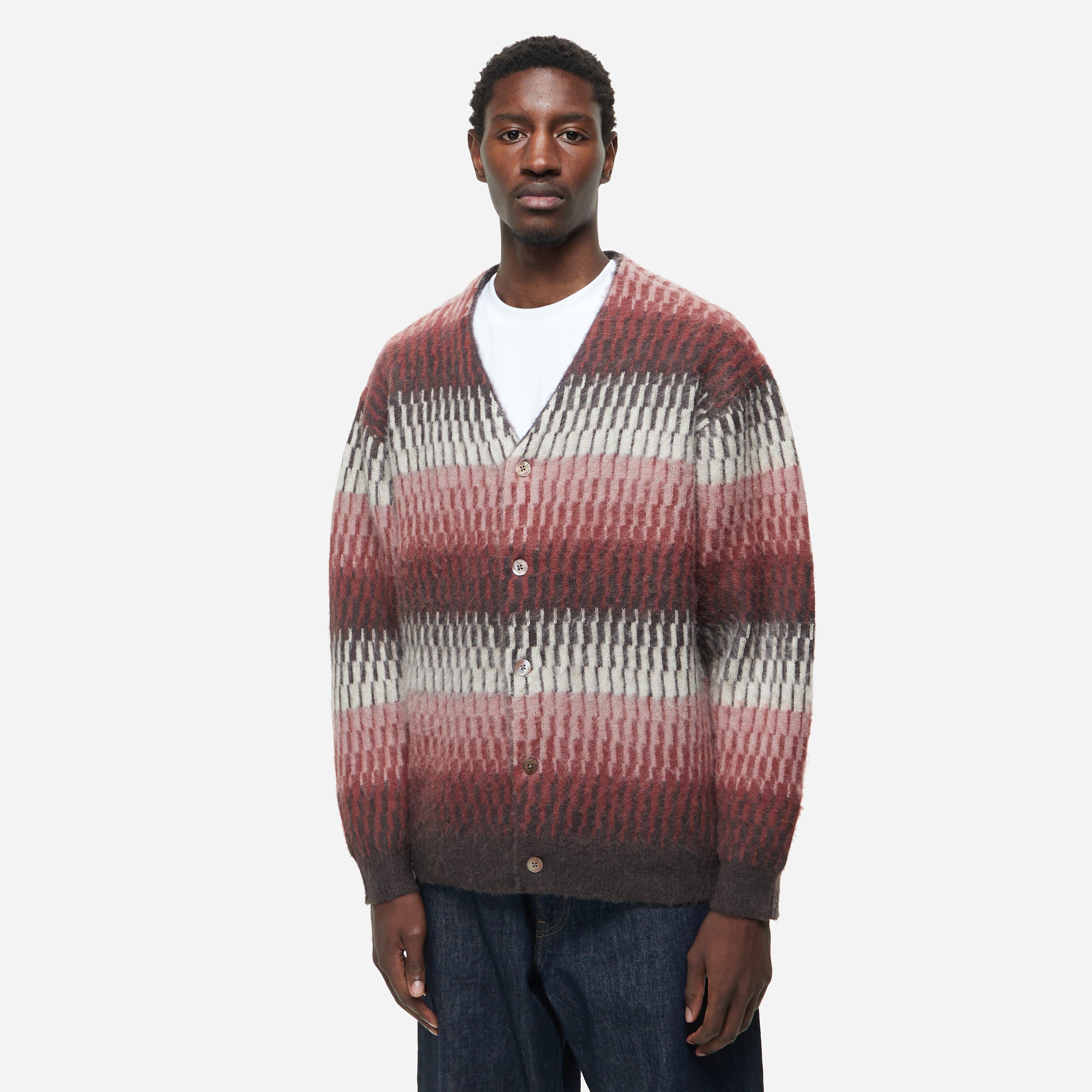 The Shore Cardigan is decorated with a border pattern in a relaxed silhouette. Pink - 35% nylon, 33% alpaca, 32% wool - Button closure - Relaxed fit - Model is 6'1" and wears size medium.