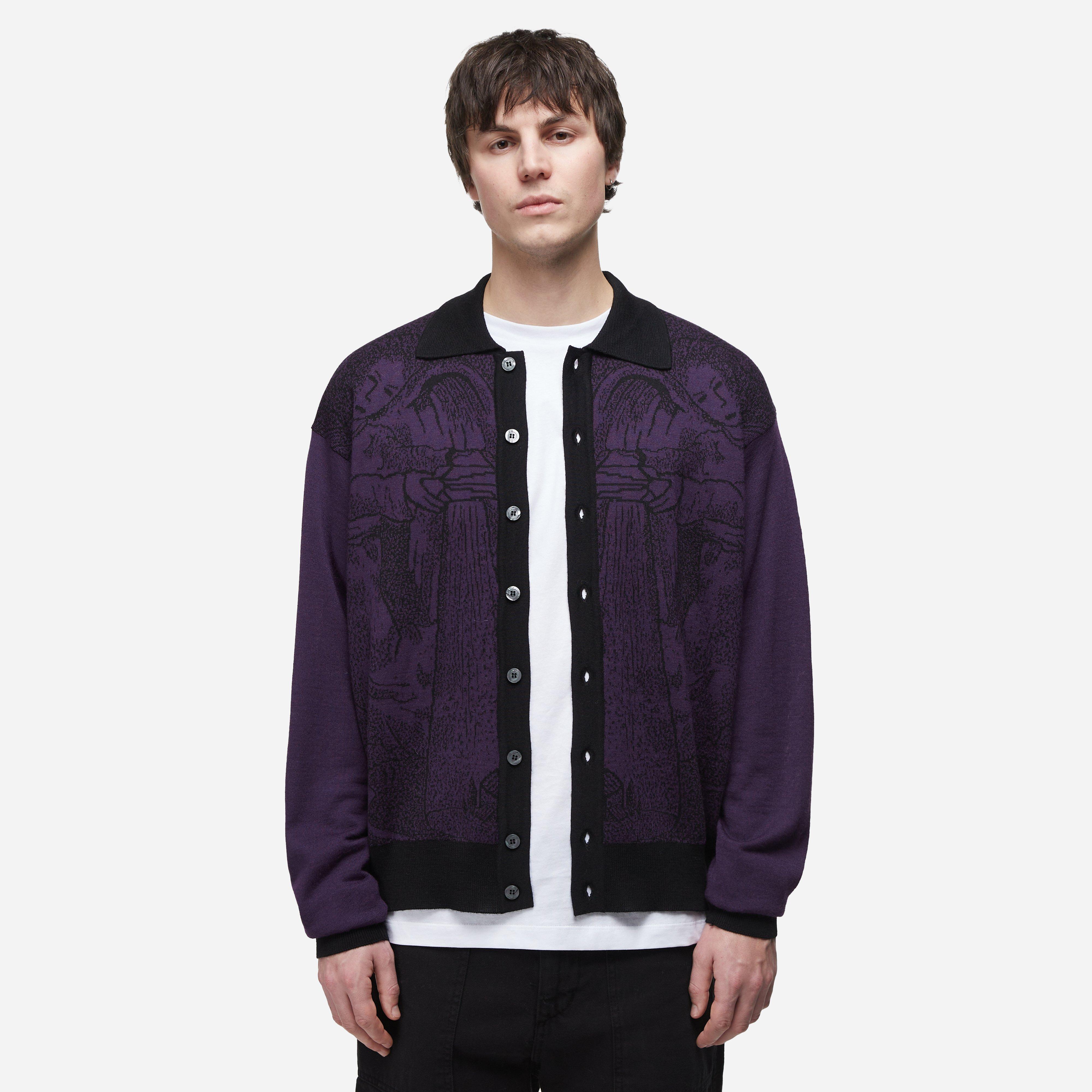 The brand presents disruptive imagery from vintage sci-fi, rave culture and the avant-garde artists of Soviet iconography - applied here across a rich Italian wool-blend. Purple - 50% wool, 50% acrylic - Button closure - Ribbed trims - Intarsia knit graphic - Regular fit, take your normal size - Model is 6'1" and wears a size medium.