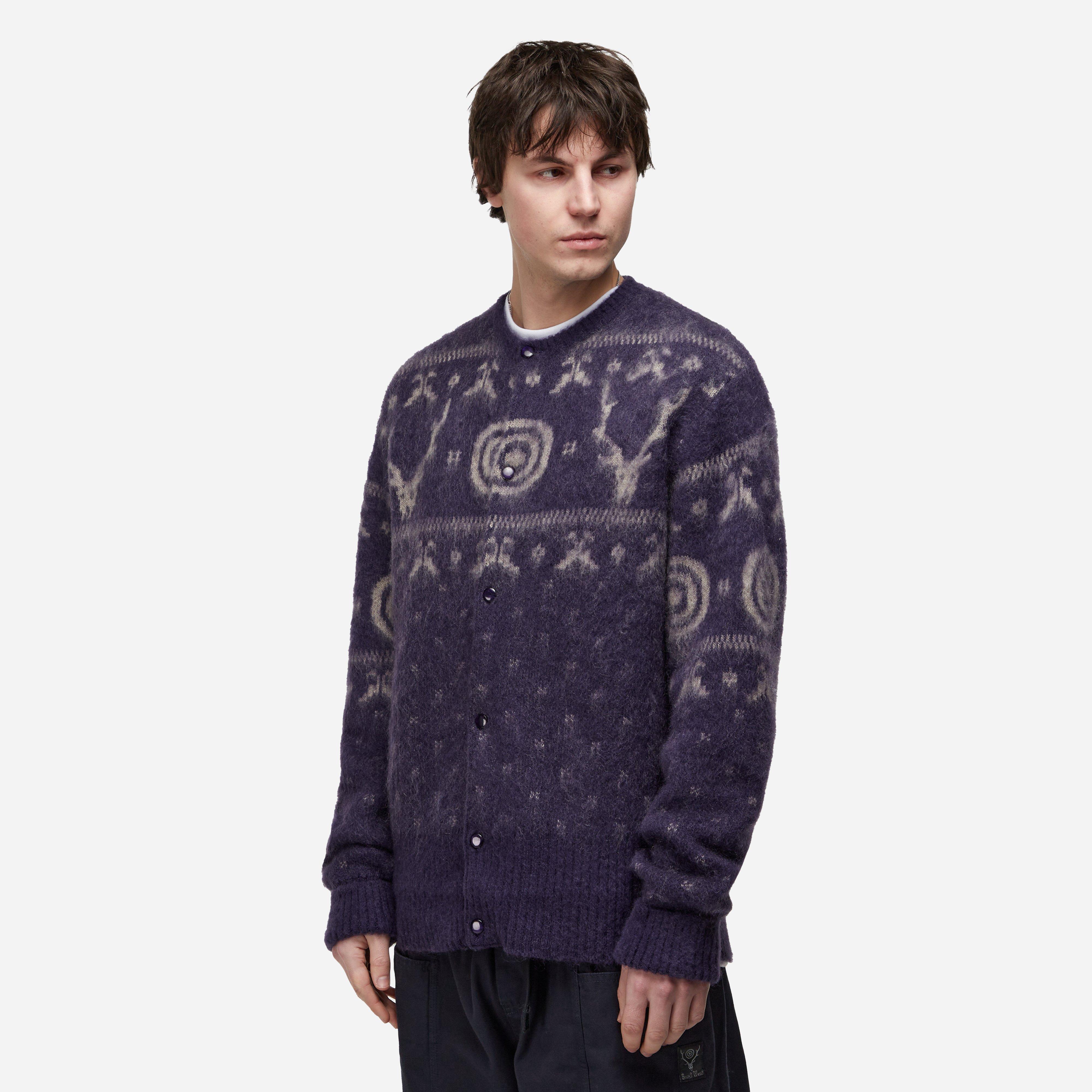 The light weight feel and high heat retention properties make the garment an appealing autumn-winter option. Purple - 55% mohair, 30% nylon, 15% rayon - Button closure - Ribbed trims - Jacquard pattern - Made in Japan - Regular fit, take your normal size - Model is 6'1" and wears a size medium.