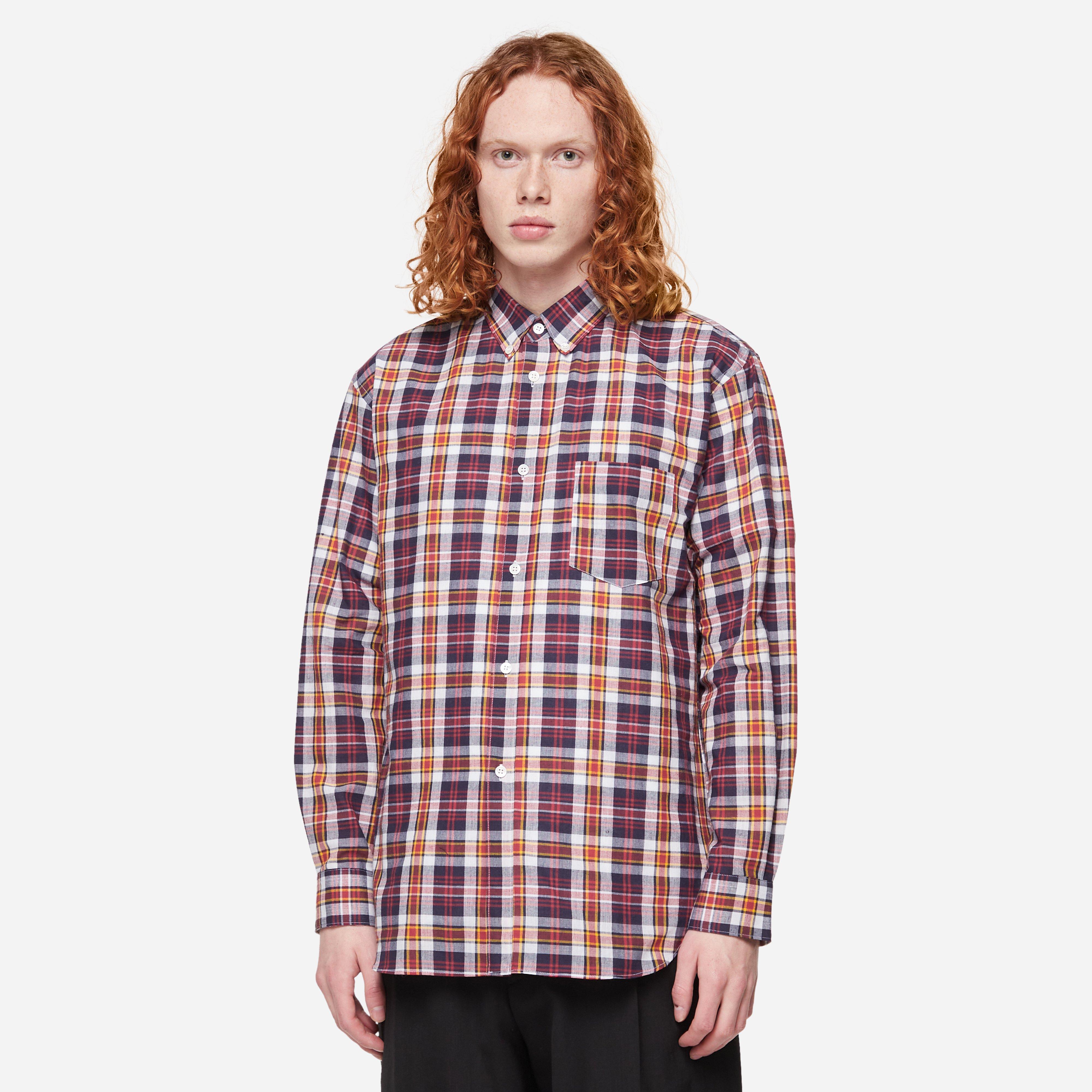 Red - 100% cotton - Chest pocket - Button cuffs - Curved hem - Model is 6'1" and wears size medium.