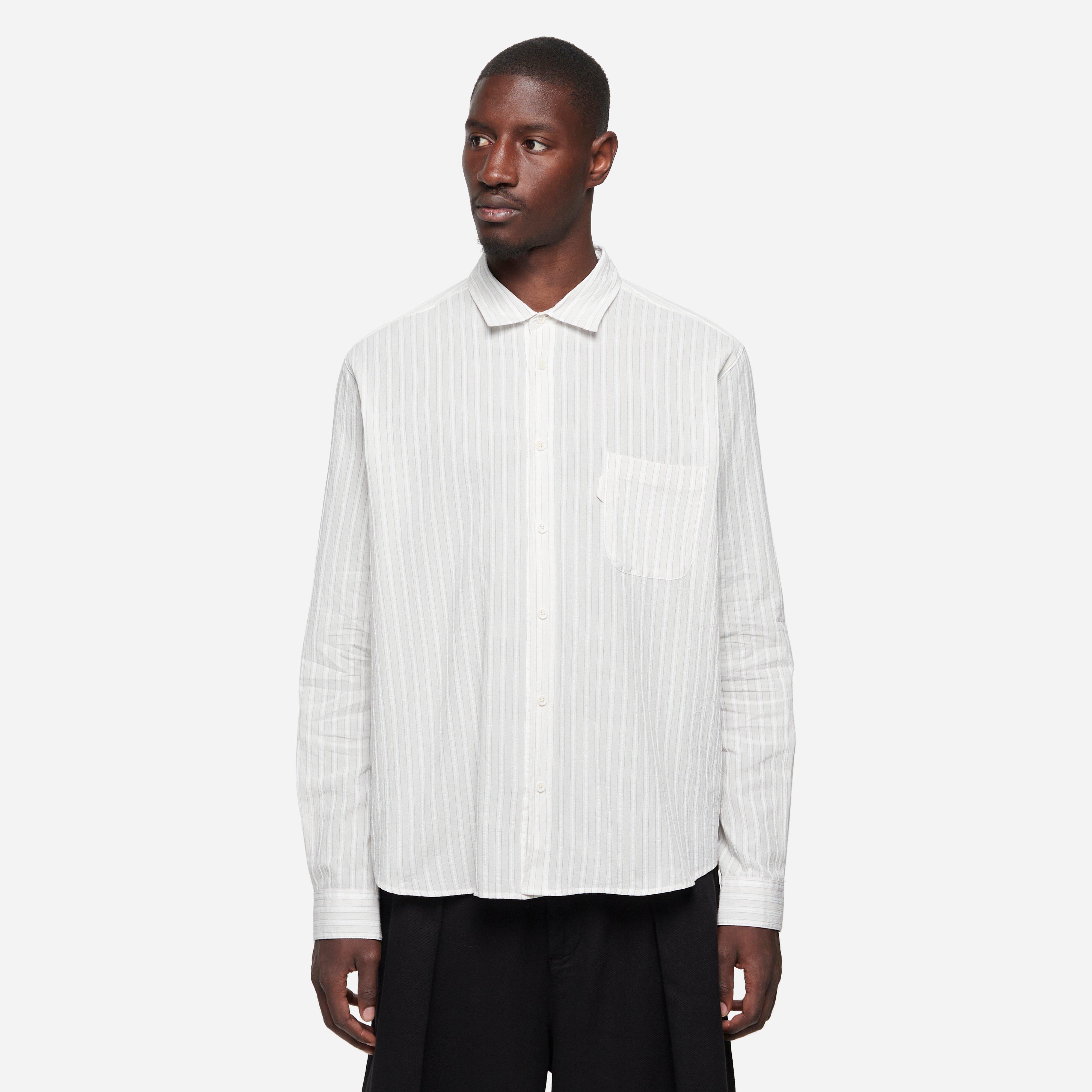 White - 100% cotton - Regular fit - Japanese millwashed pinstripe cotton - Textured finish - Chest patch pocket with loop detail - Corozo buttons - Model is 6'1" and wears a size medium.