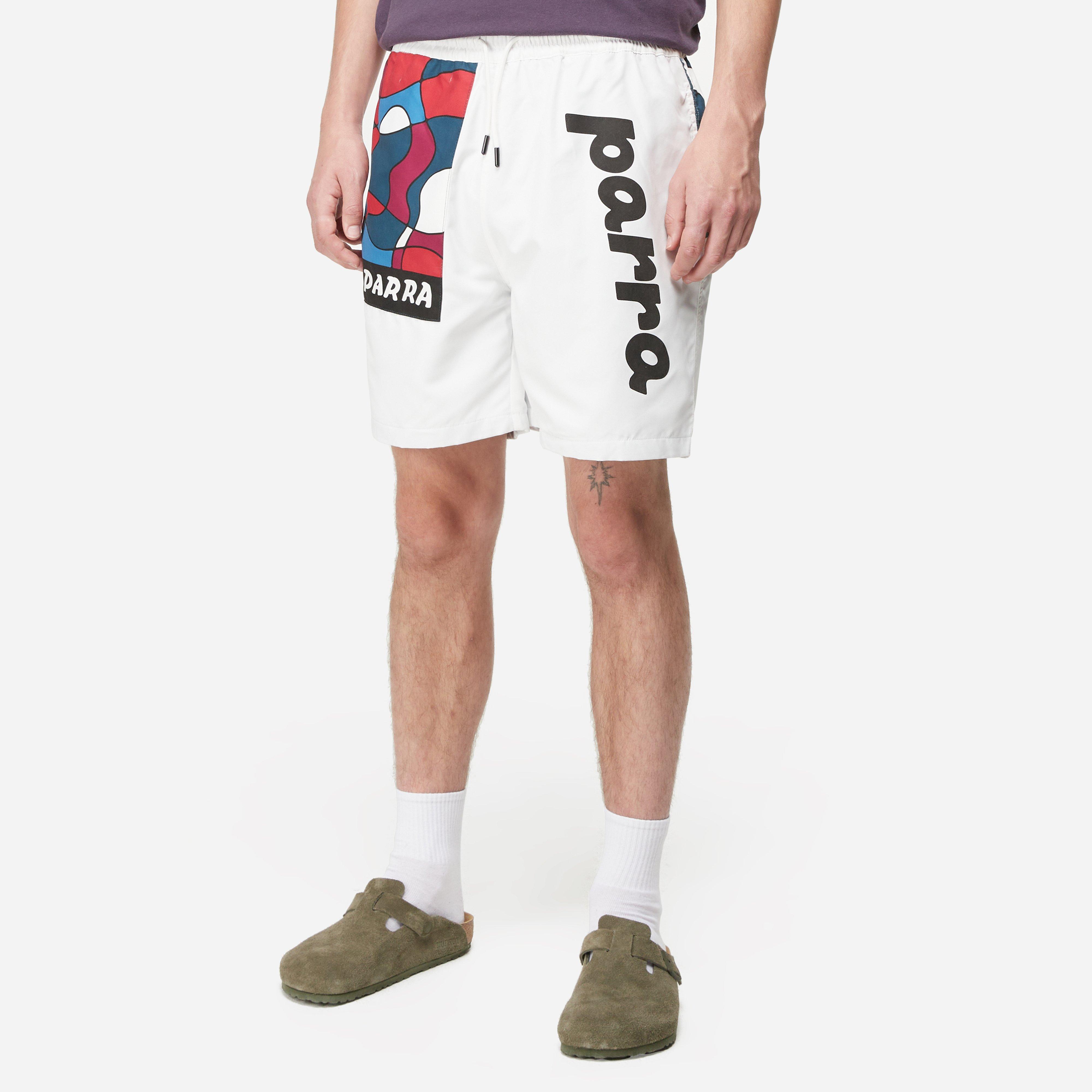 White - 100% nylon - Elastic drawcord waist - Mesh interior - Button closure rear pocket - Printed artwork - Regular fit, take your normal size - Model is 6'1" and wears a size medium - Waist size guide not stretched (in.) - S=28.4, M=30.4, L=31.4, XL=34.2.