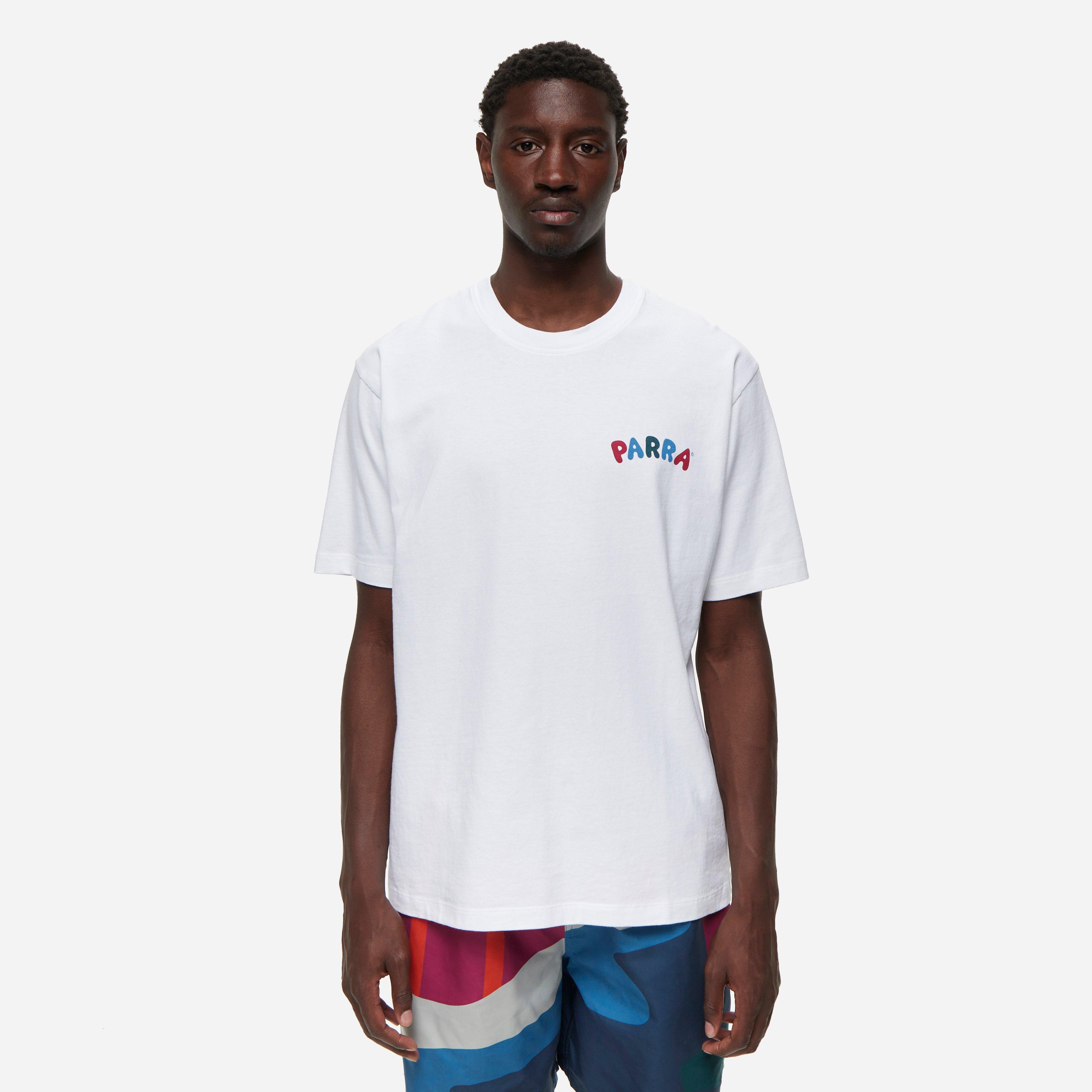 White – 100% cotton – 240gsm – Eco pre washed – Graphic prints – Made in Portugal – Model is 6’1’’ and wears a size medium.