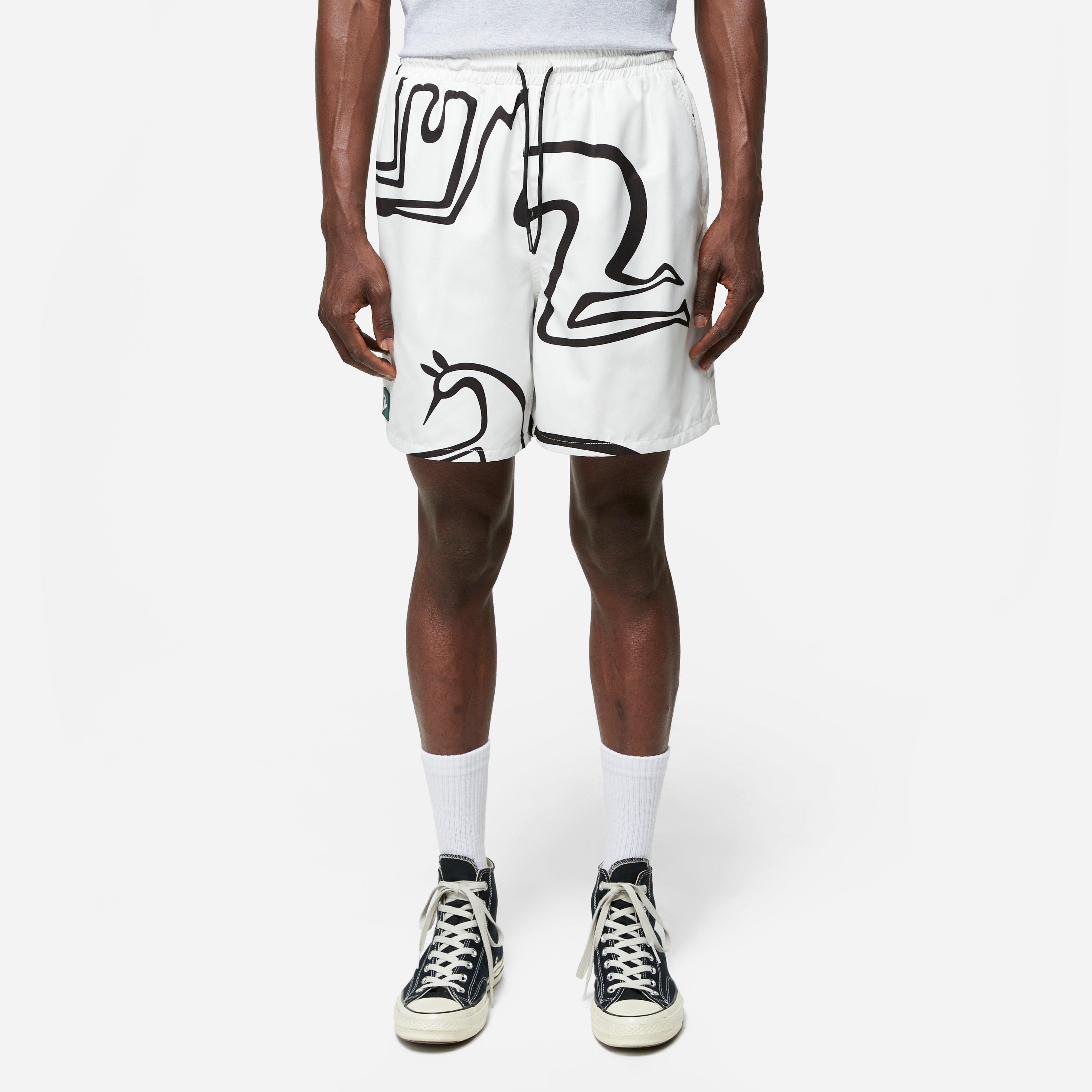 White – 100% polyester – Mesh interior – Fast drying fabric – Two side pockets – Elasticated waistband – Drawcord functionality – Key pocket – Rubber application – Model is 6’2’’ and wears a size medium.