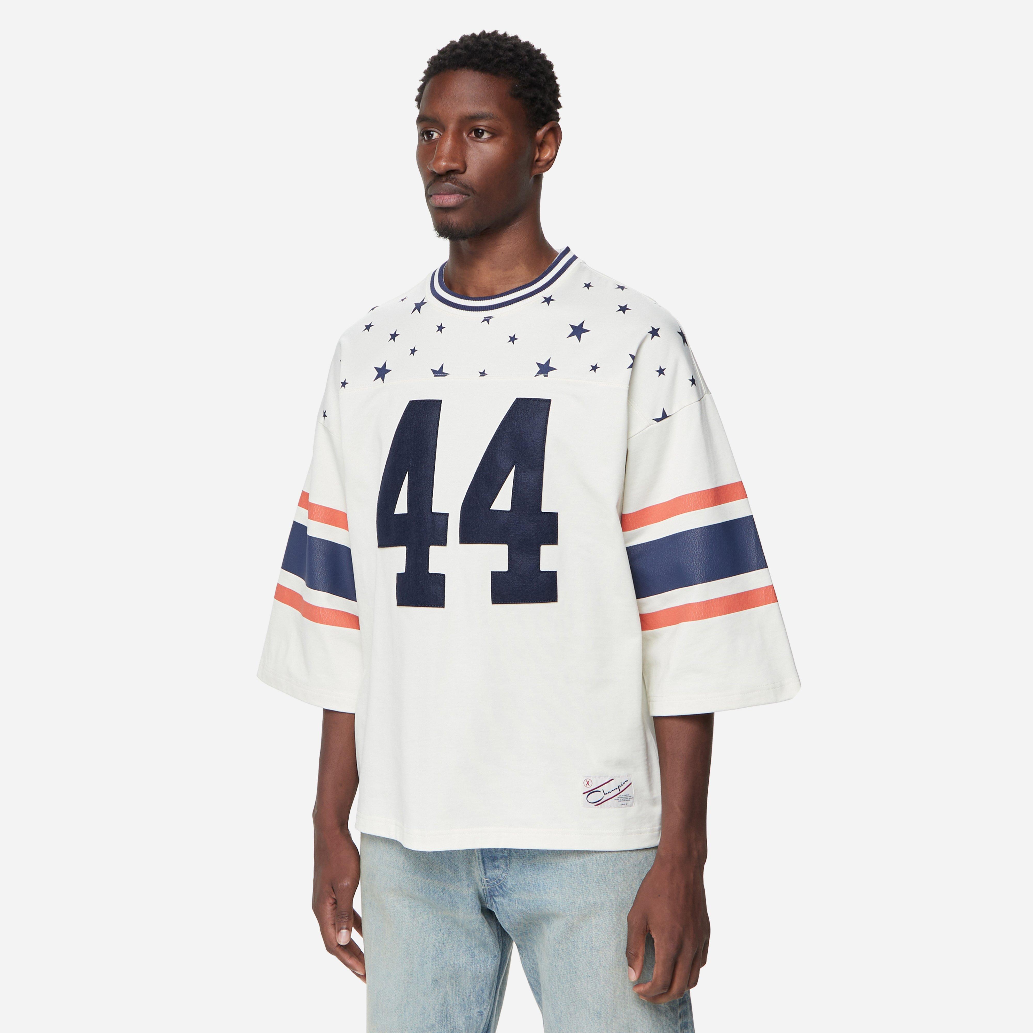 White – 53% cotton/47% nylon – Dropped shoulders – Numerical felt embroidery – Flocked stars applique – Rib inserts – Jacquard label – Model is 6’1’’ and wears a size medium.