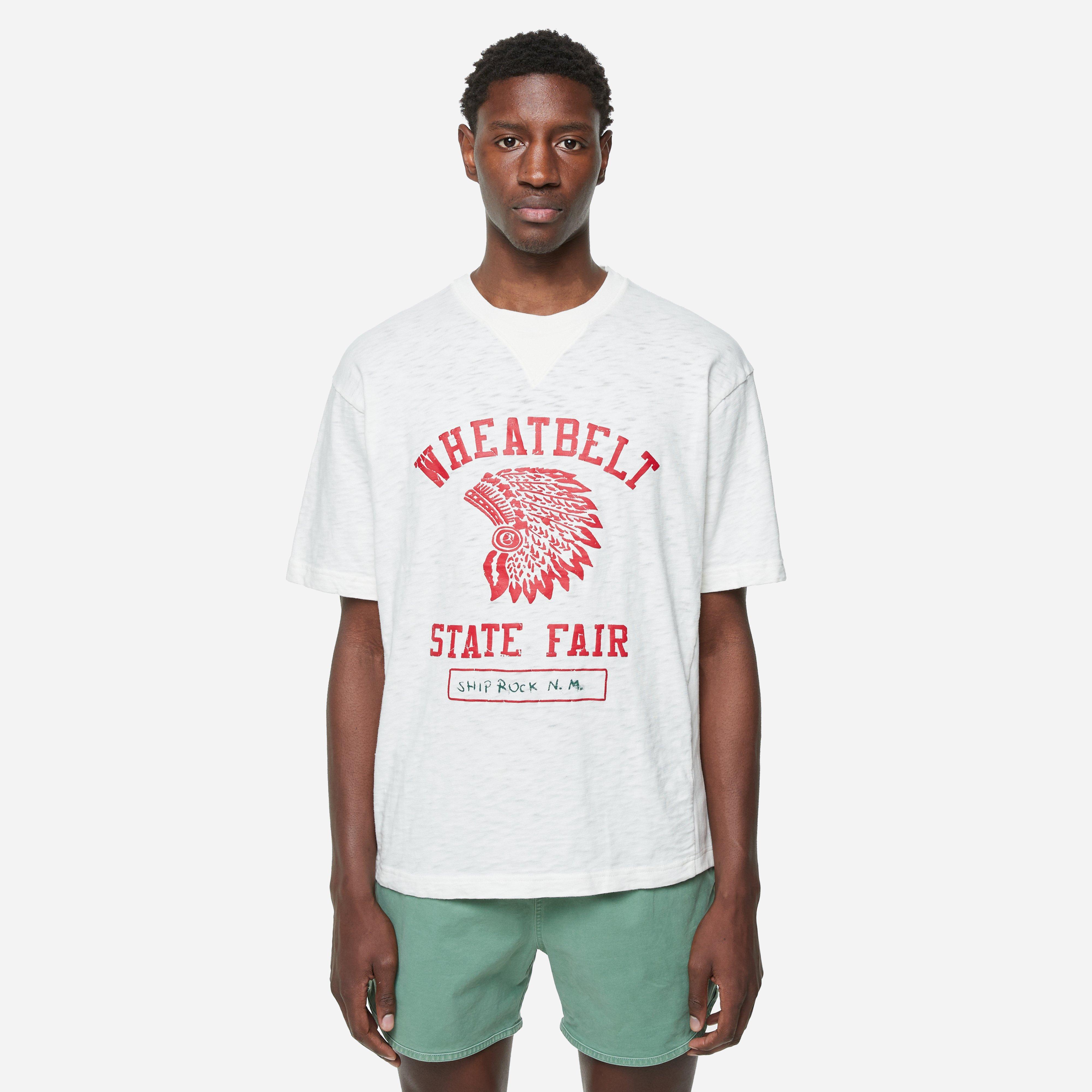 White – 100% cotton – Loose fit – 240gsm slub fabric – Crew neck – Graphic print – Sleeve logo embroidery – Model is 6’1’’ and wears a size medium.