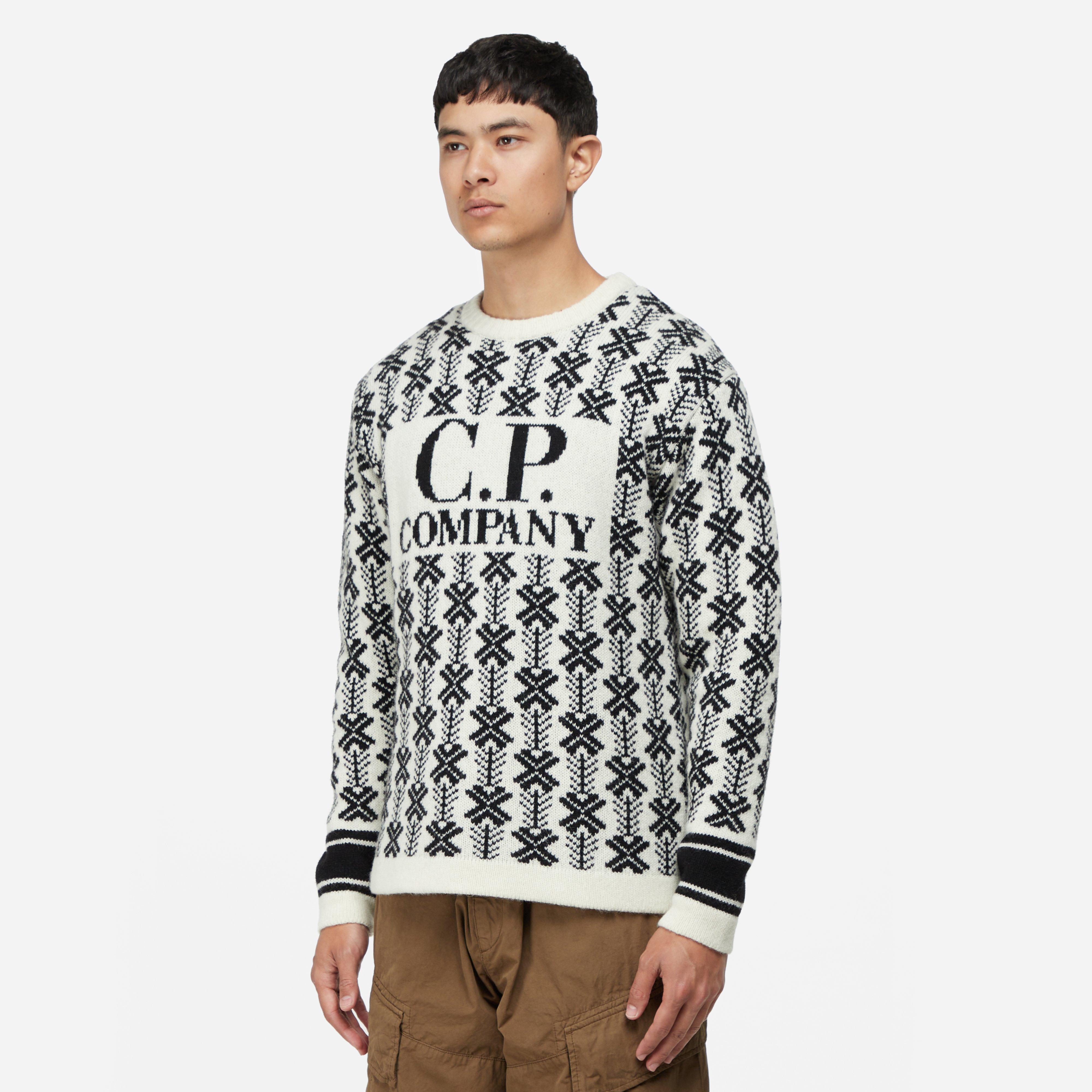 P Company look towards high-end Fall-Winter staples with this Knitted Sweatshirt, adorned with a bold pattern and jacquard branding insignia. The piece is crafted using pure virgin wool for an insulative and soft to touch fit. White - 100% virgin wool - Ribbed trims - Jacquard branding - Regular fit, take your normal size - Model is 6'1'' and wears a size medium.