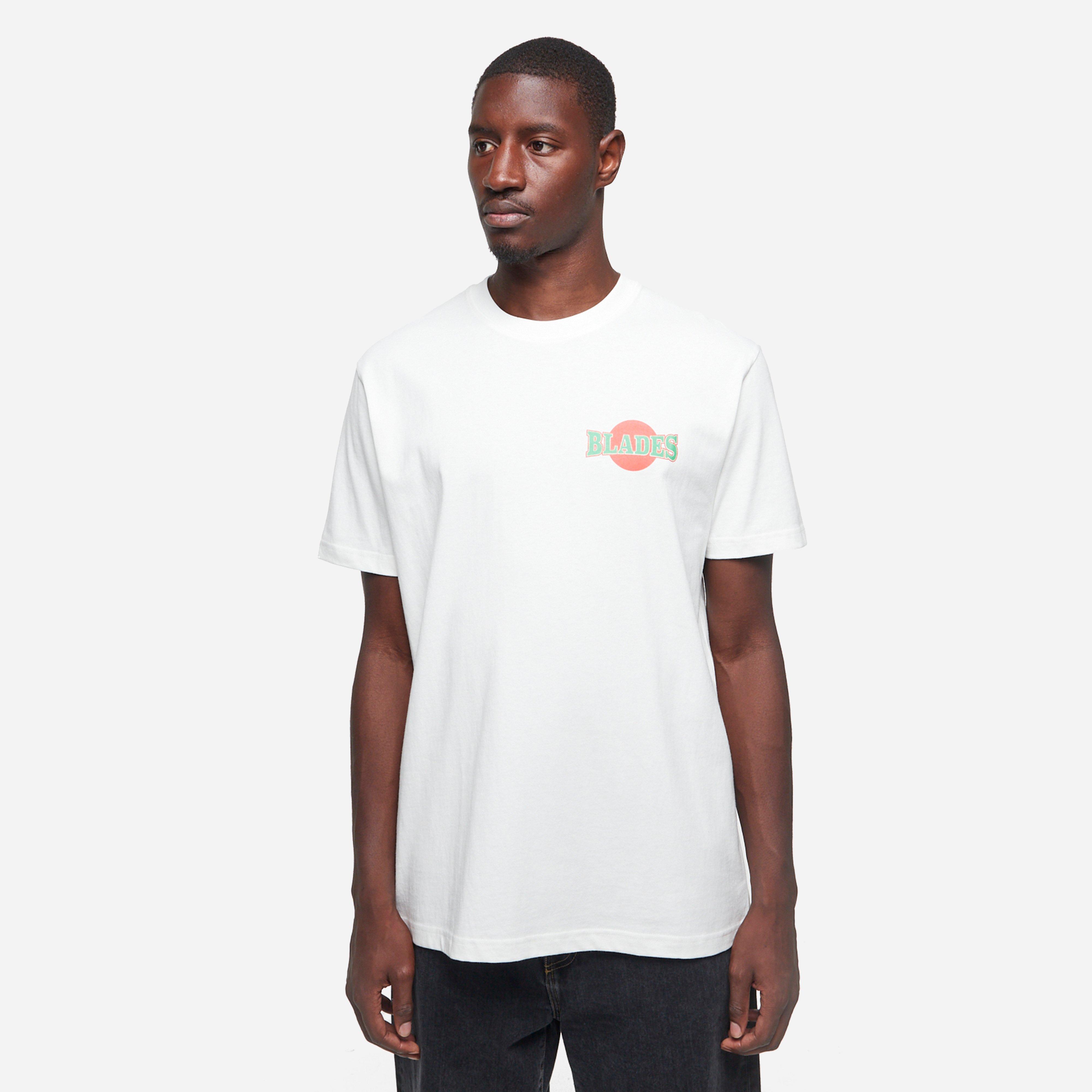 White – 100% cotton – Traditional fit – Rib collar – Screen prints – Model is 6’1’’ and wears a size medium.
