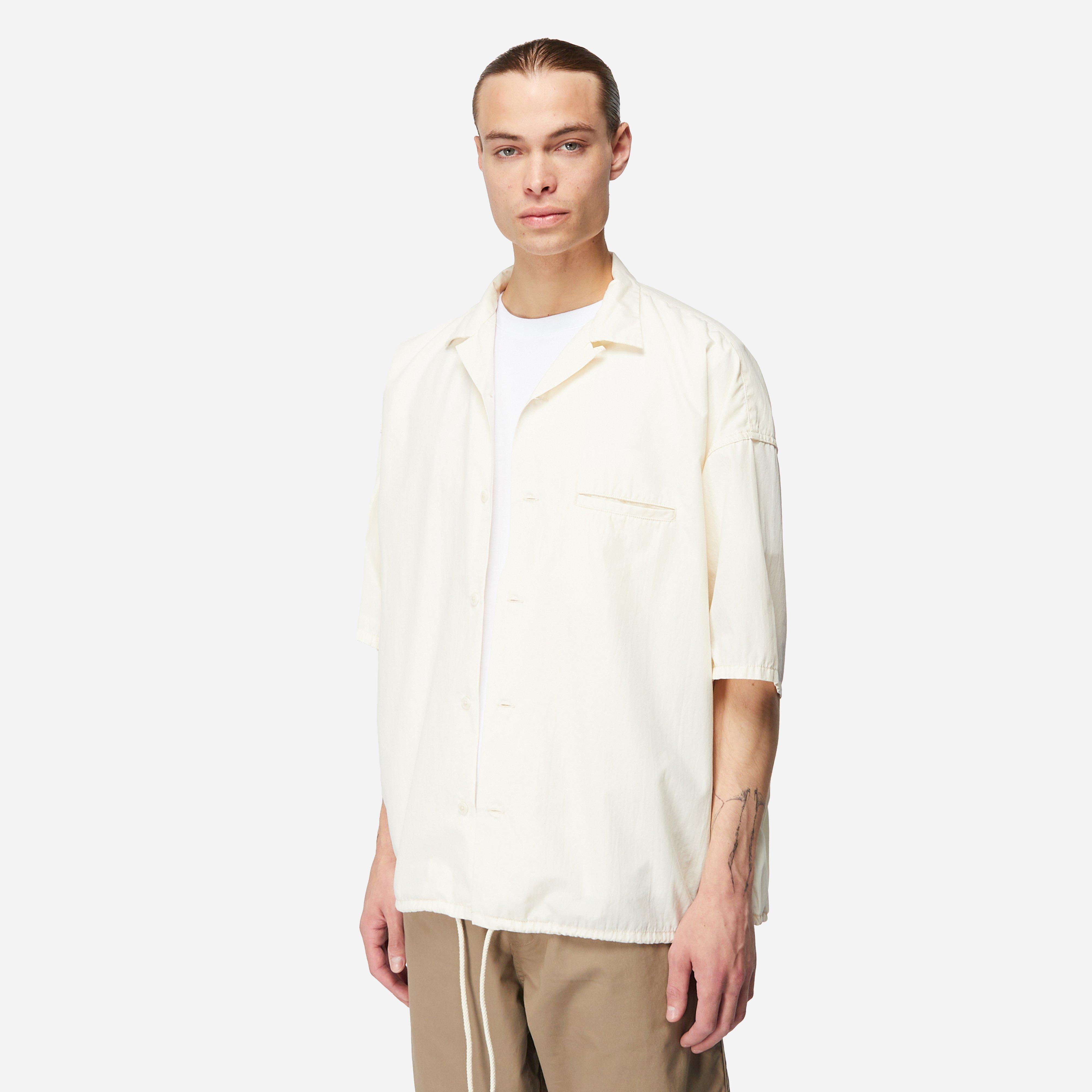 Beige - 60% cotton, 40% polyester - Open collar - Drawstring hem - Chest pocket - Loose fit, take your normal size - Model is 6'1" and wears a size medium"
