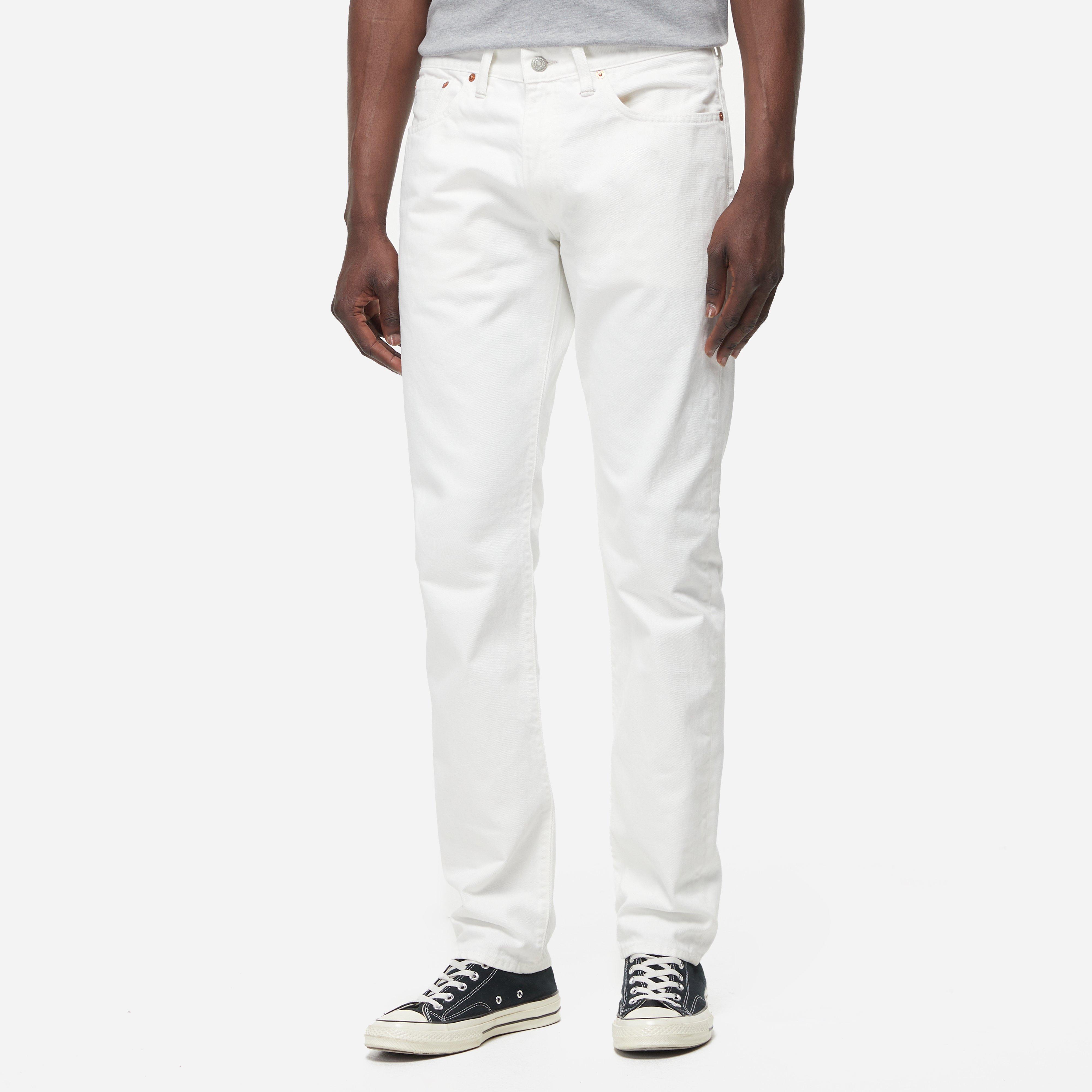 8oz Japanese right-hand twill. White - 100% cotton - Button fly – Belt loops - 5-pocket with metal American made rivets – Slim leg fit - Model is 6'2" and wears a size 32.