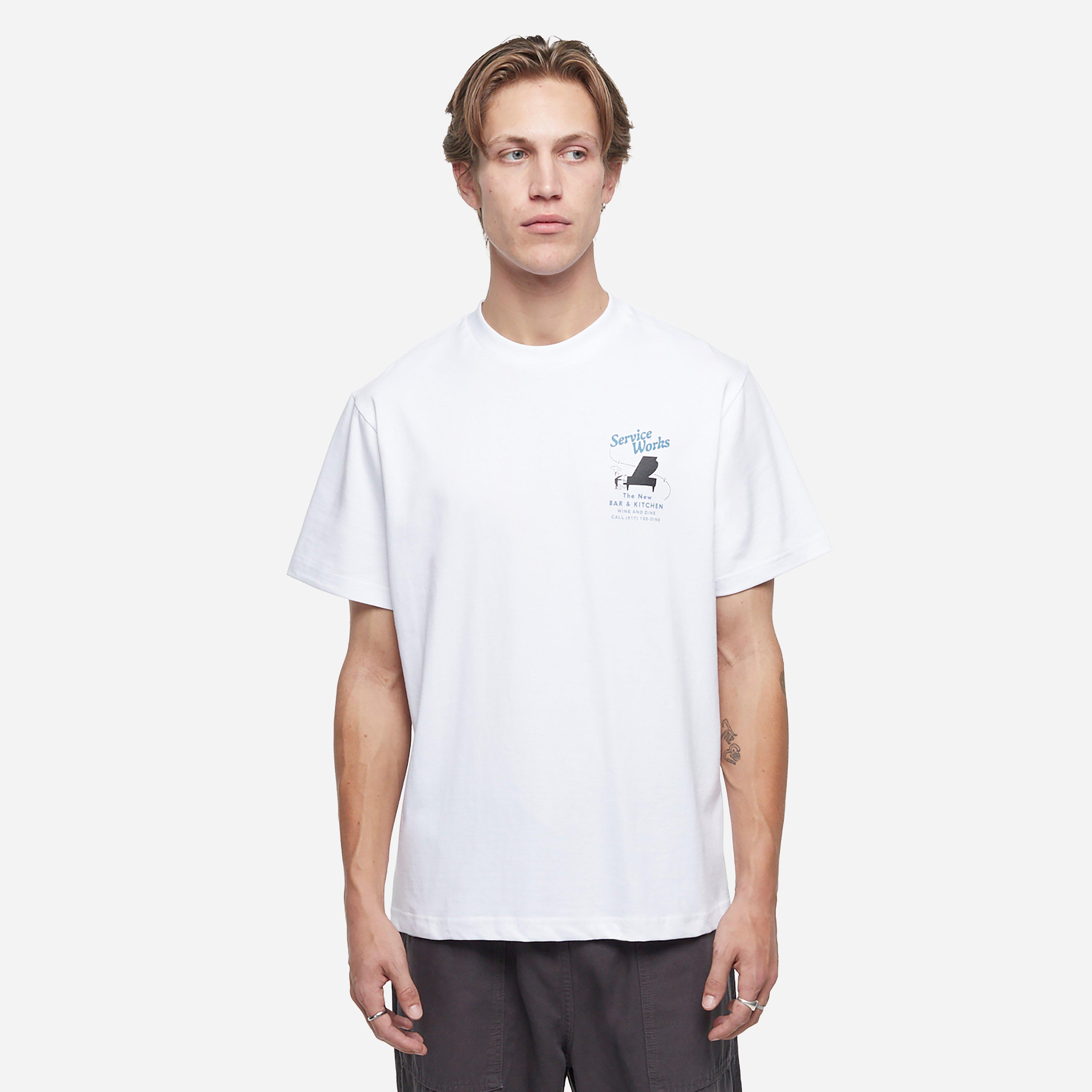 White - 100% cotton - Screen printed graphic - 250gsm - Model is 6'2.5" and wears a size medium