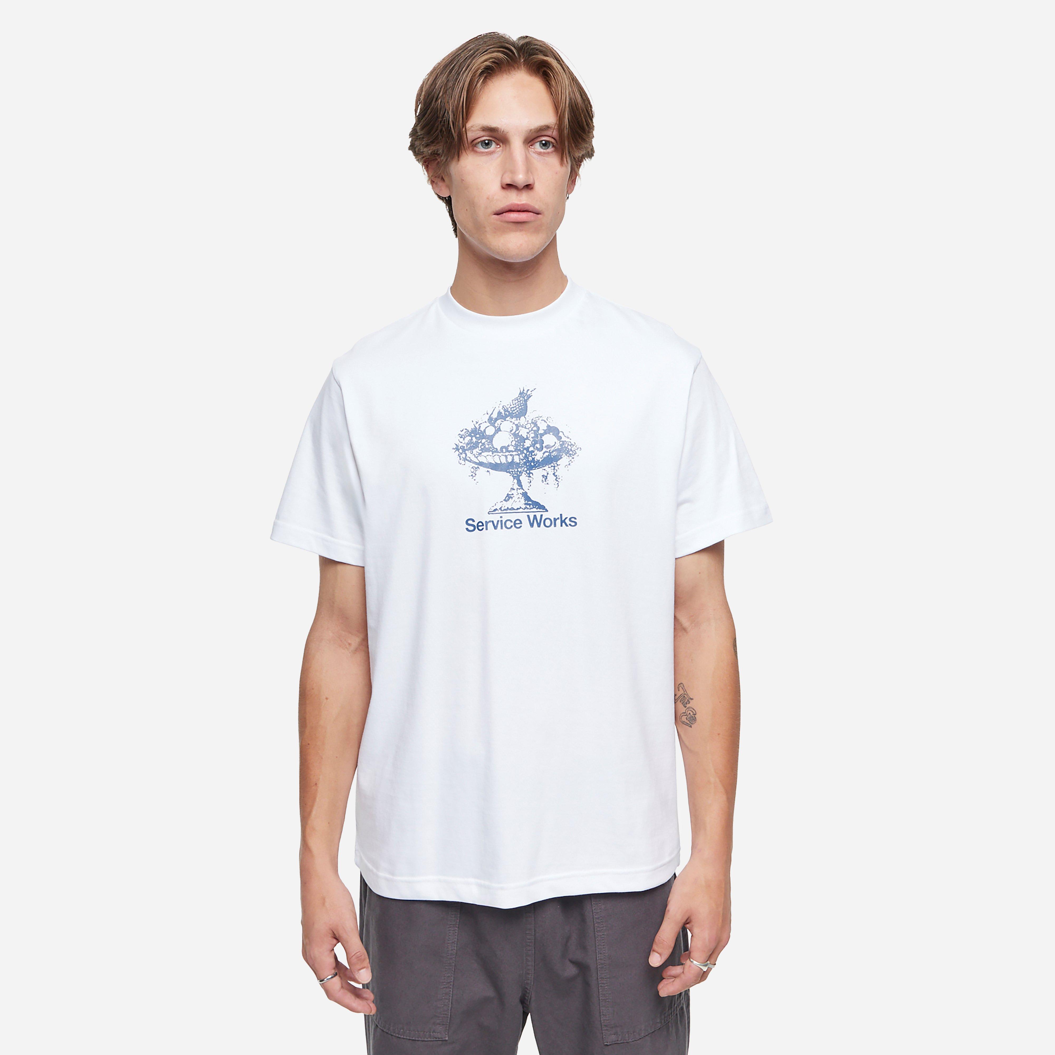 White - 100% cotton - Screen printed graphic - 250gsm - Model is 6'2.5" and wears a size medium