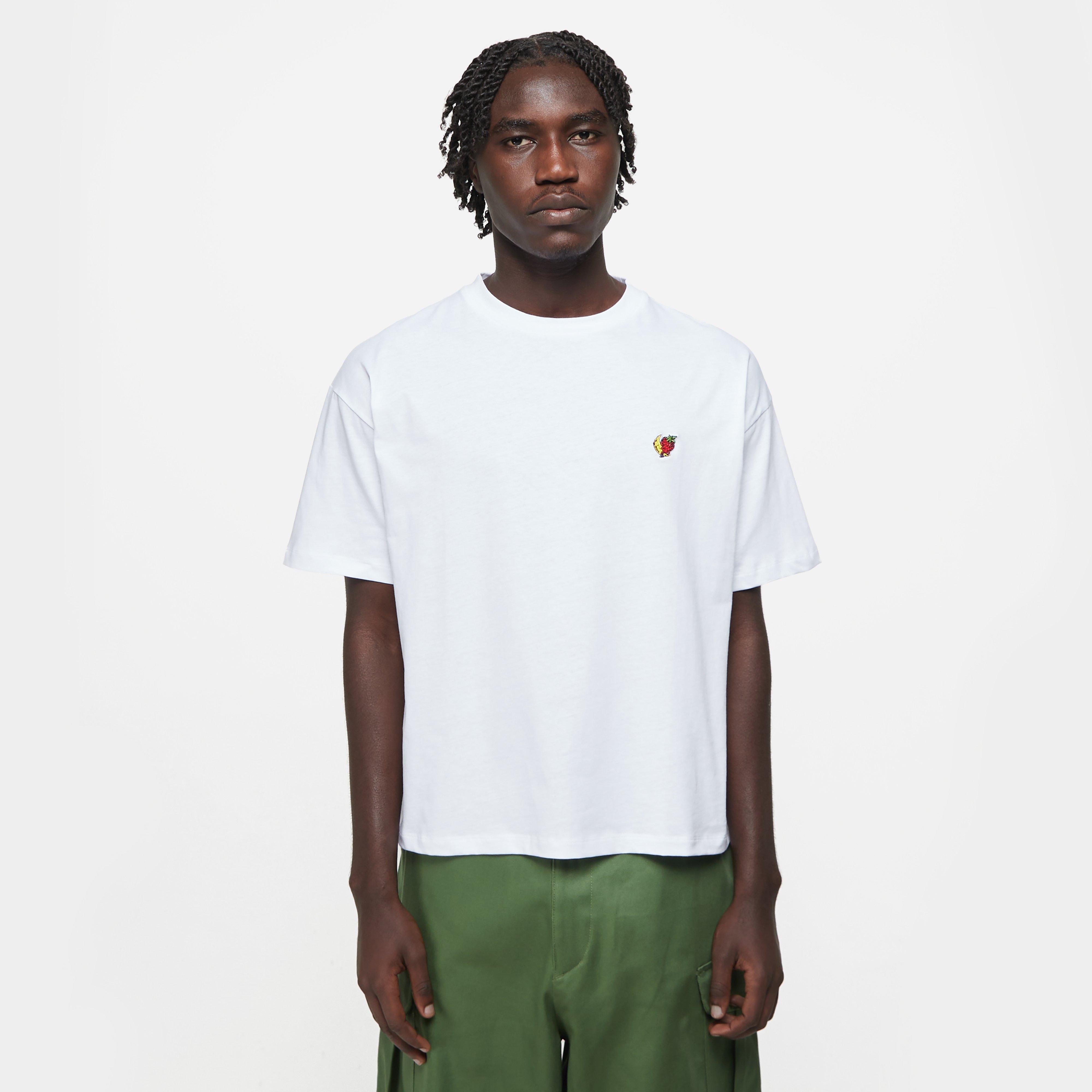 White – 50% recycled cotton/50% organic cotton – Strawberry Moon embroidery – Model is 6’2’’ and wears a size medium.