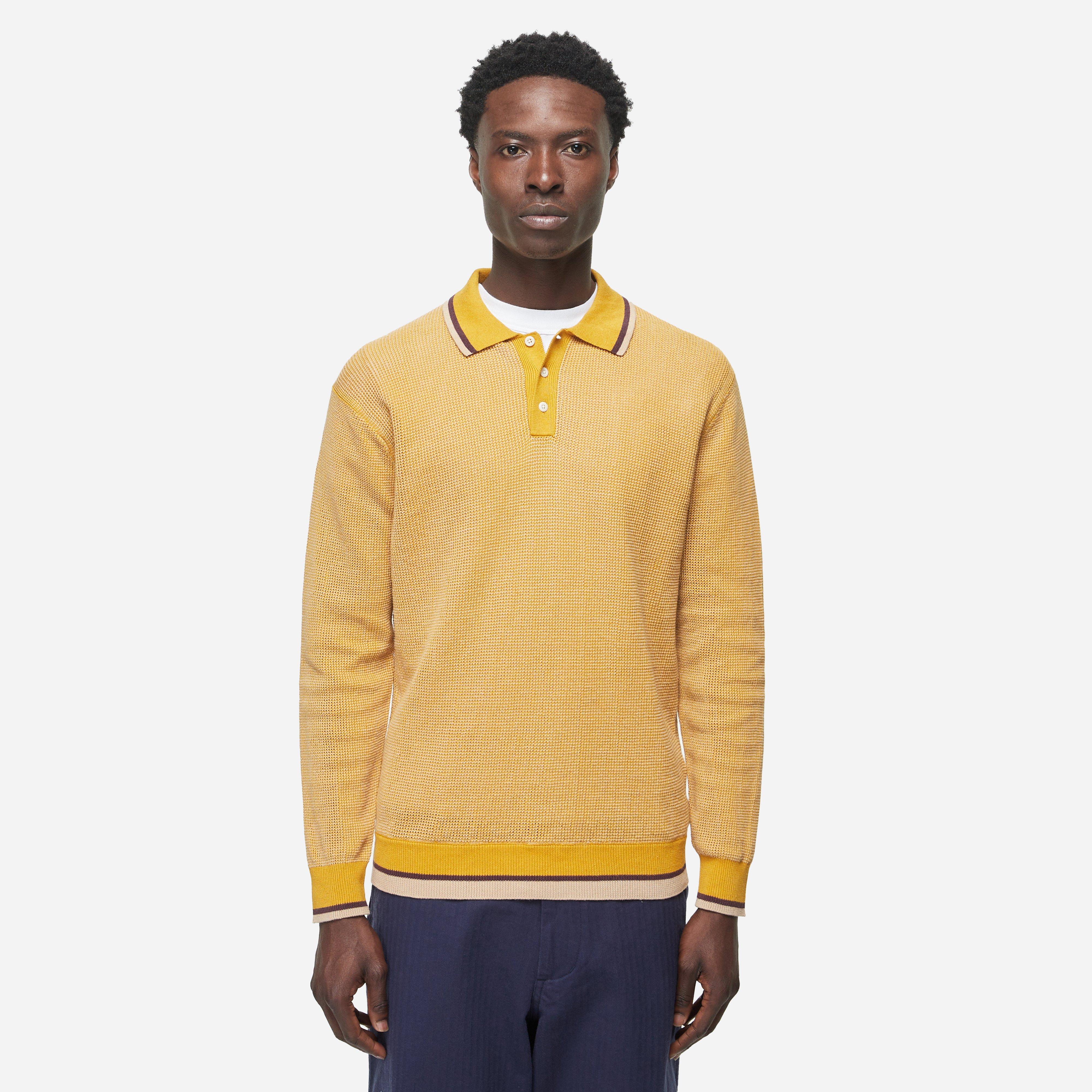 Mustard – 54% ramie/46% cotton – Spread collar – Three button placket – Ribbed trims – Model is 6’2’’ and wears a size medium.