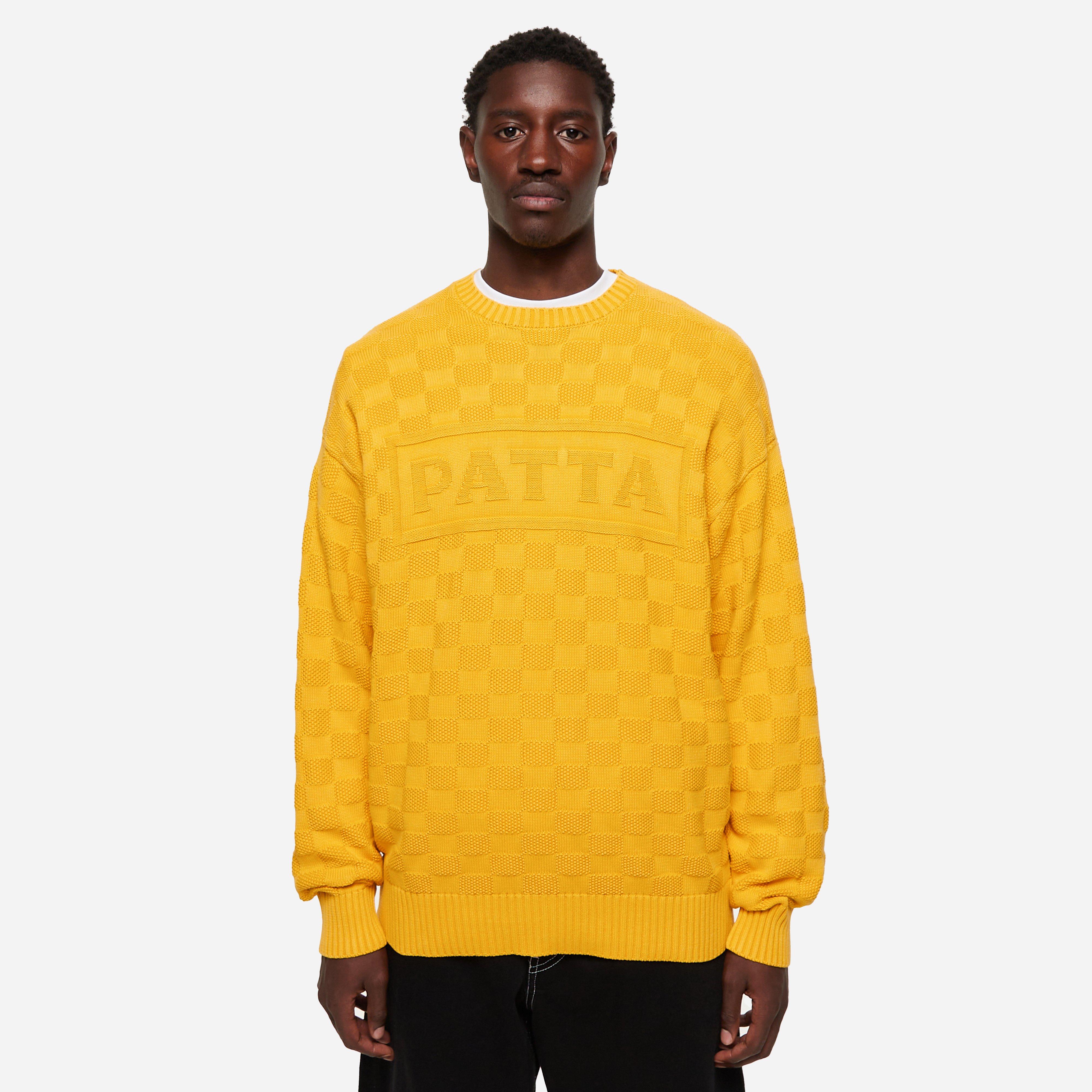 This Knitted Sweater is a unique take on texture as Patta employ a purl stitch that creates a chessboard pattern - the piece is finished with debossed applique Patta branding. Yellow - 100% cotton - Purl stitch - Ribbed trims - Debossed applique branding - Relaxed fit, take your normal size - Model is 6'1" and wears a size medium.