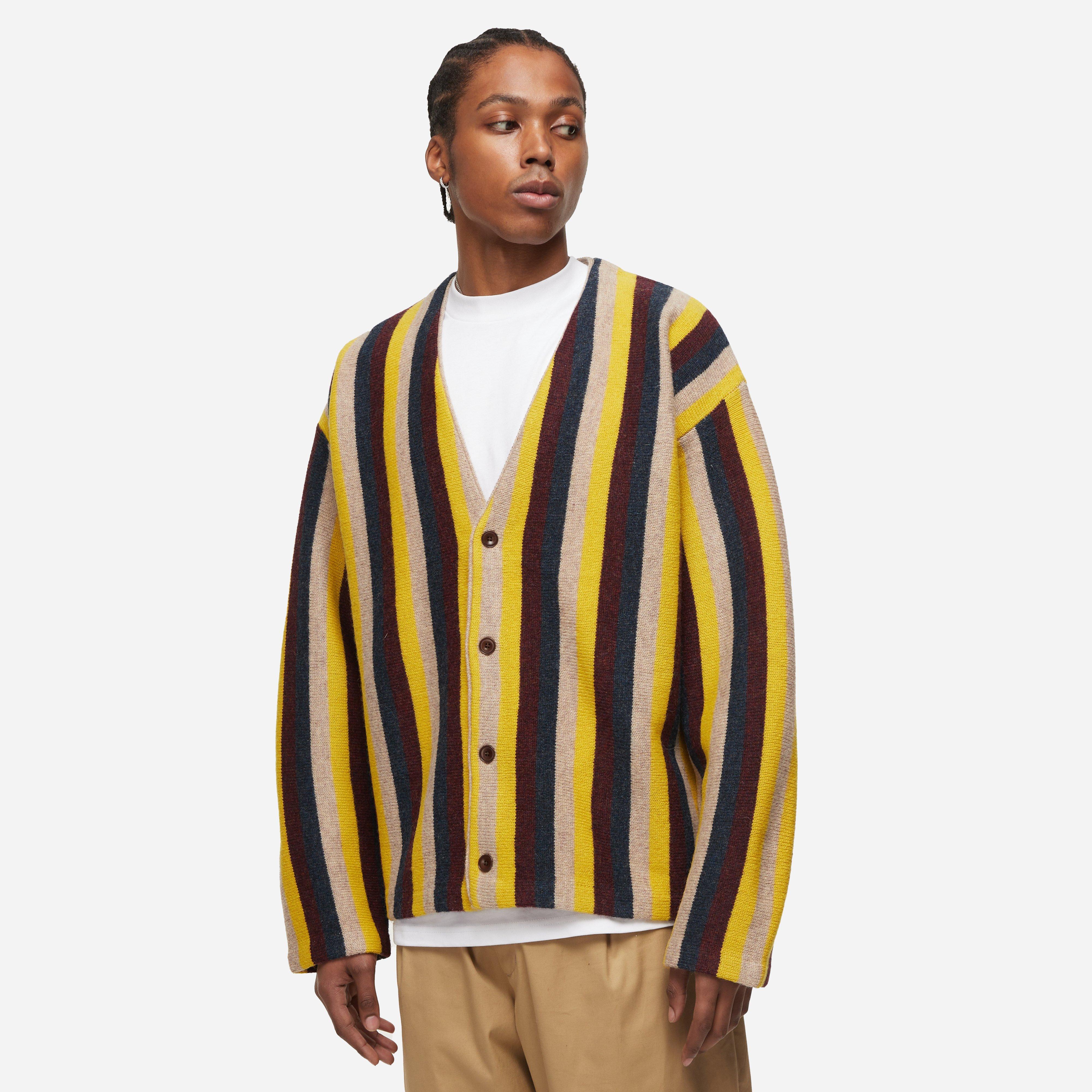The Kanoa Cardigan by Brooklyn-based Pilgrim Surf Supply is a clean-cut silhouette with no ribbing at the hem or cuffs, produced in a beautiful stripe Shetland wool.